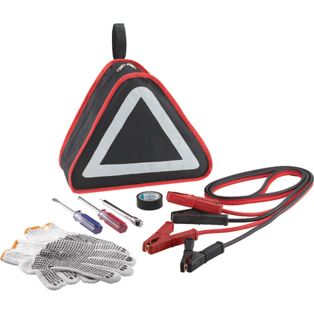 The Emergency Auto Kit features a zippered reflective carry case with open storage pocket contains 100-amp jumper cables, flathead screwdriver, Phillips-head screwdriver, rubber electrical tape, rubber friction cotton gloves and a tire gauge. It also has a reinforced top carry handle.