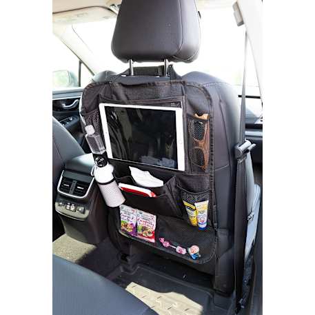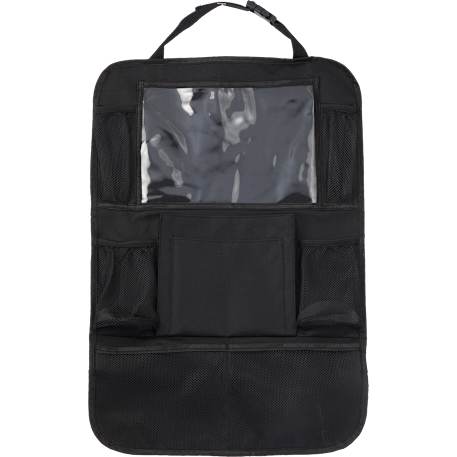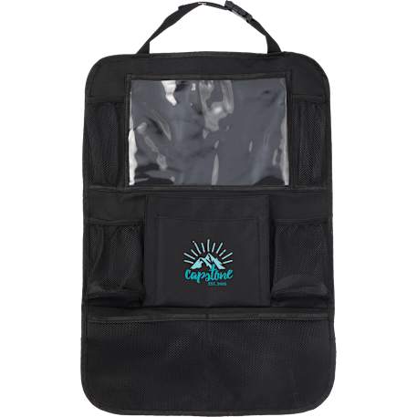 Keep your car clutter-free and your passengers entertained with this versatile Recycled Back Seat Car Organizer. Designed for busy families, road trips, and daily commutes, this organizer offers a smart storage solution that blends convenience with durability. This organizer features 6 mesh pockets, clear window that fits tablets up to 10" and two middle spacious pockets. It also features two adjustable straps to secure the organizer in place.