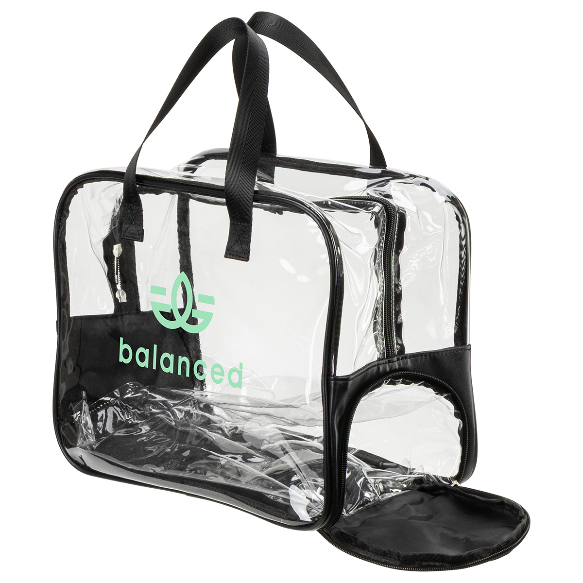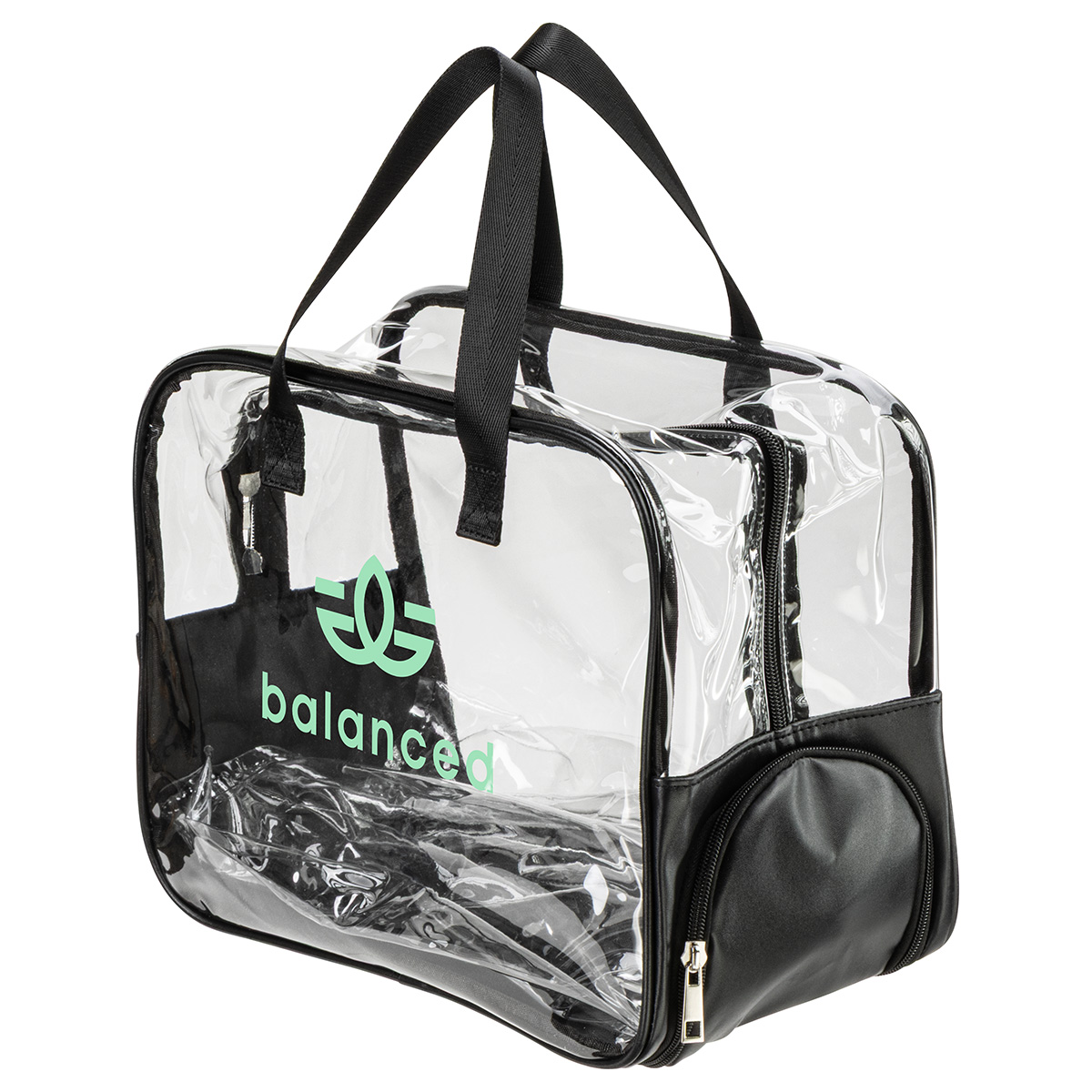 The Gem Clear PVC Zippered Bag With Easy-Access Shoe Compartment is a versatile, transparent tote designed for convenience. Made from durable PVC with sleek black trim, it features a roomy zippered main compartment and a separate shoe section to keep items clean and organized. The long 17-3/4" shoulder handles make carrying effortless, while its compact, packable design and easy-to-clean surface make it perfect for travel, gym, or events.
