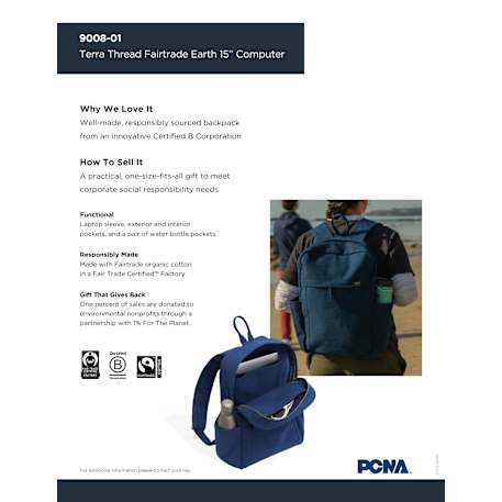 Looking for a sustainably and ethically made backpack for college, work, travel, hiking or other outdoor activities? The spacious and durable Terra Thread Fairtrade Earth 15" Computer Backpack is the workhorse of our line, built for everyday carry with heavy-duty 14oz. certified organic cotton canvas that is made in a Fair Trade Certified™ Factory. The generous main compartment is divided with a no-fuss sleeve for your laptop and one small interior pocket to keep things organized. Two water bottle sleeves and the large zippered exterior pocket keep hydration and frequently needed items close at hand. Your purchase also supports Feeding America's campaign to end hunger by helping donate meals to kids and families in need.