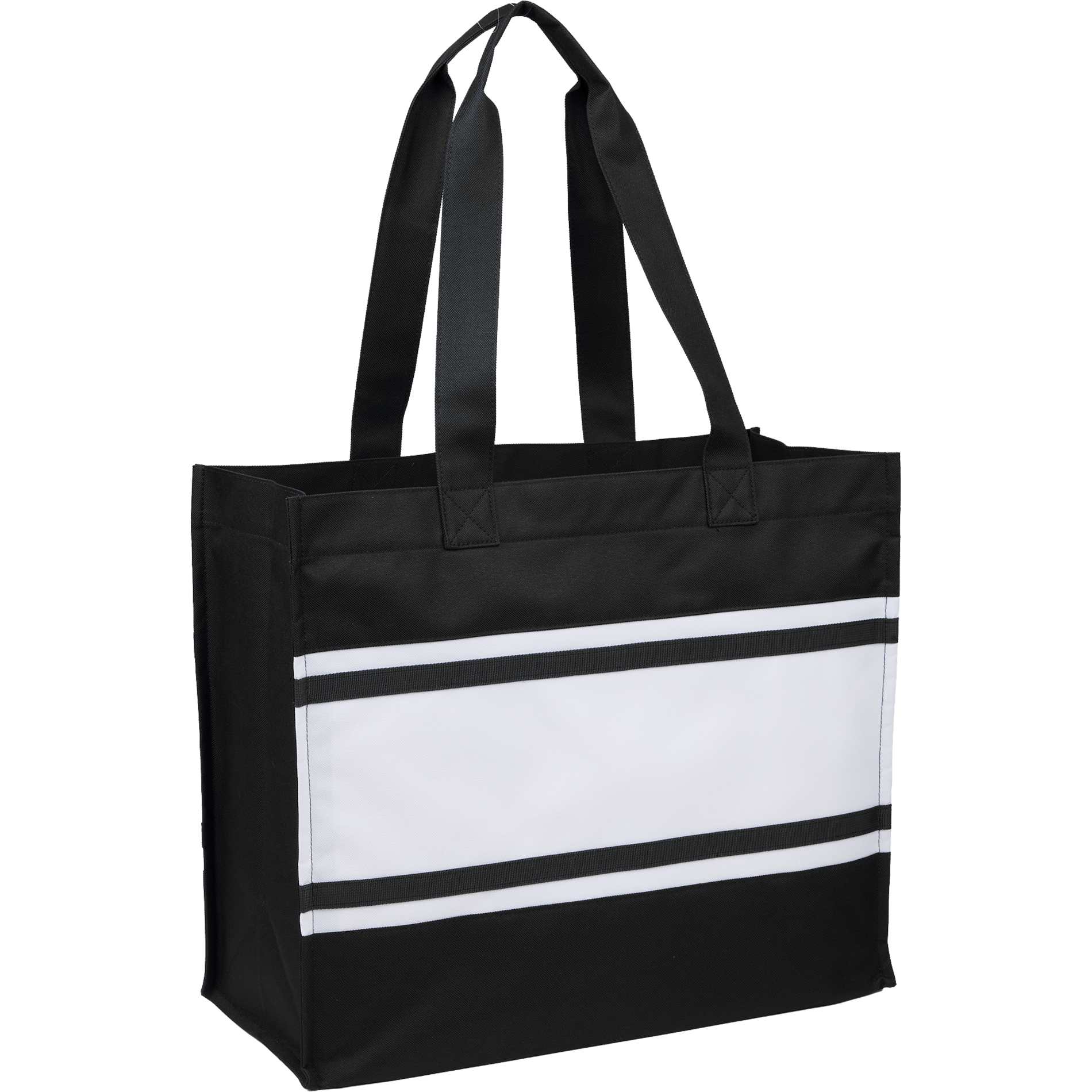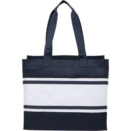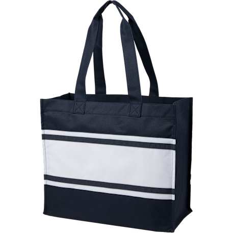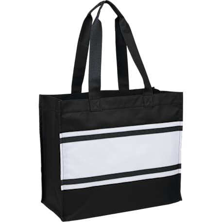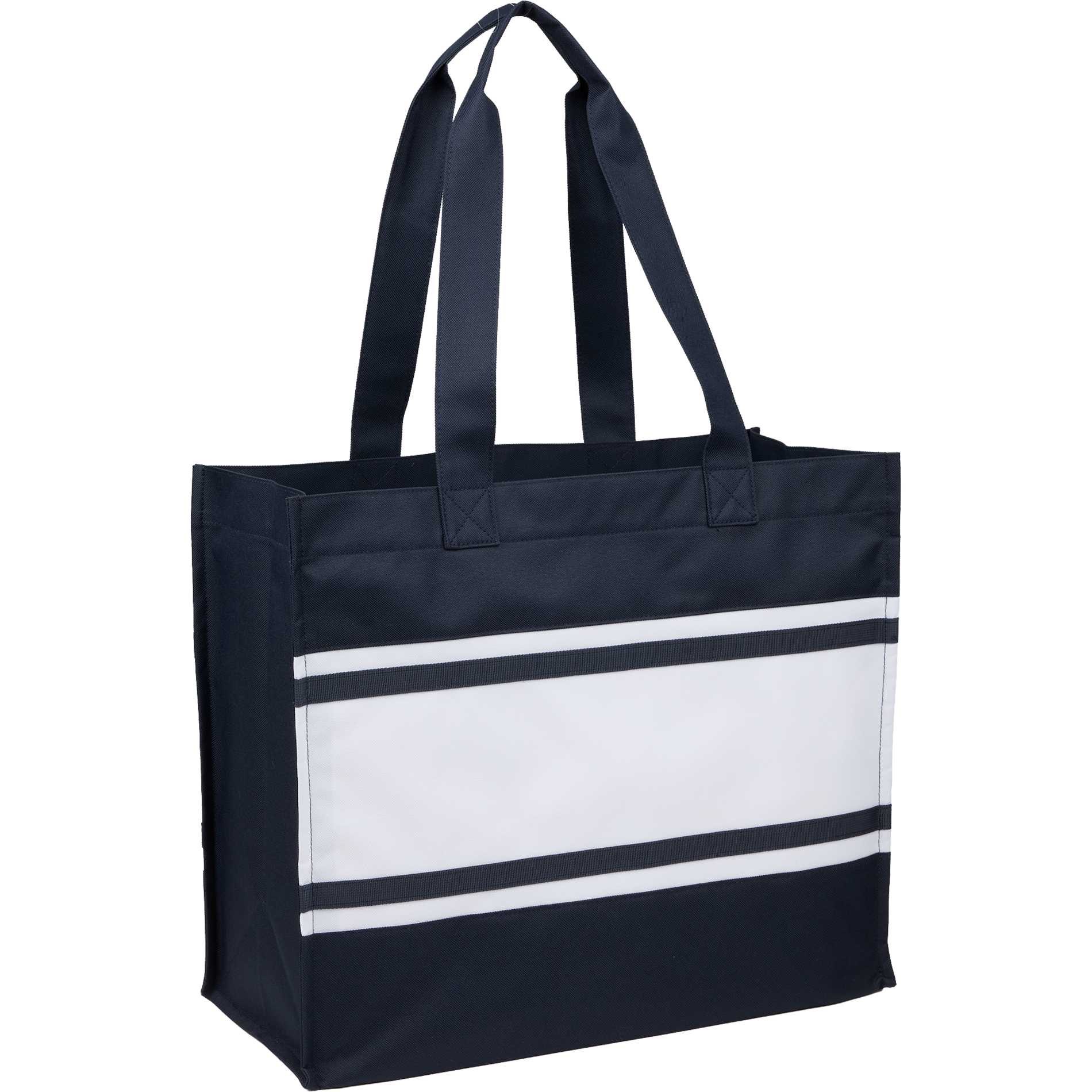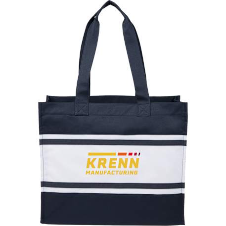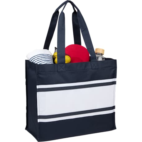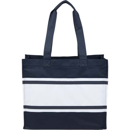 The Varsity Box Tote combines a structured silhouette with a sporty edge, making it a versatile choice for work, travel, or everyday use. It features a striped detail on the front and back that adds a touch of athletic style. The roomy interior and reinforced pinched handles allow for carrying heavier loads with ease, while the boxy shape offers a mode and polished look. Through a partnership with 1% For The Planet, a portion of each sale supports environmental nonprofits.
