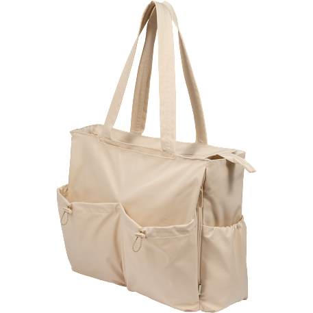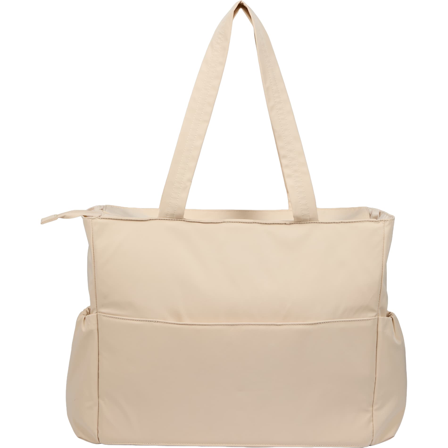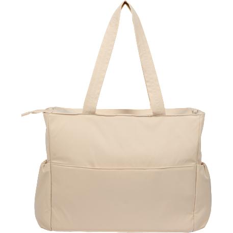 The RPET Wellable Sport Tote, designed to meet the needs of your active lifestyle while offering practical and stylish functionality. This spacious bag offers multiple storage solutions to keep you organized. Two front pockets with detailed cord closures provide quick access to smaller essentials, a top inside edge pocket with hook-and-loop closure keeps items secure. For additional space, two hidden zippers on either side expand the bag into one large opening, ideal for holding a yoga mat or similar gear. The large open main compartment offers ample room for your belongings, and a zippered closure ensures everything stays in place. Inside, you'll find two additional pockets for smaller items, as well as a padded sleeve that comfortably fits up to a 17" laptop. For added convenience, the bag features two side pockets perfect for carrying water bottles, and a trolley sleeve on the back for easy attachment to rolling luggage.