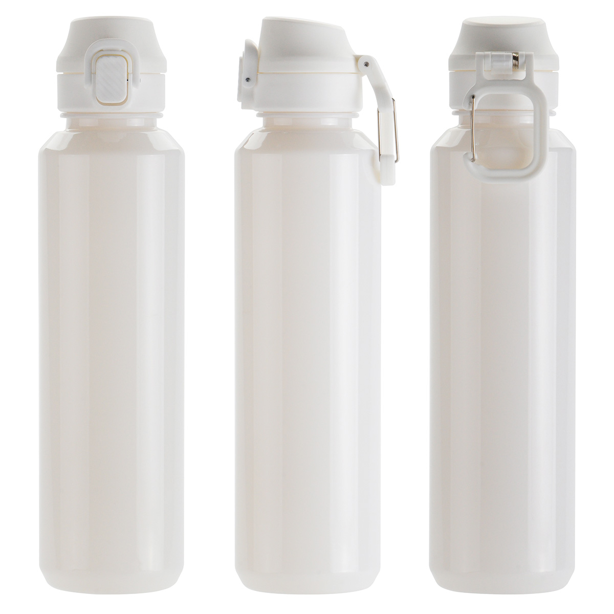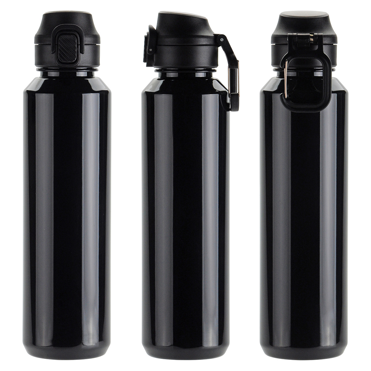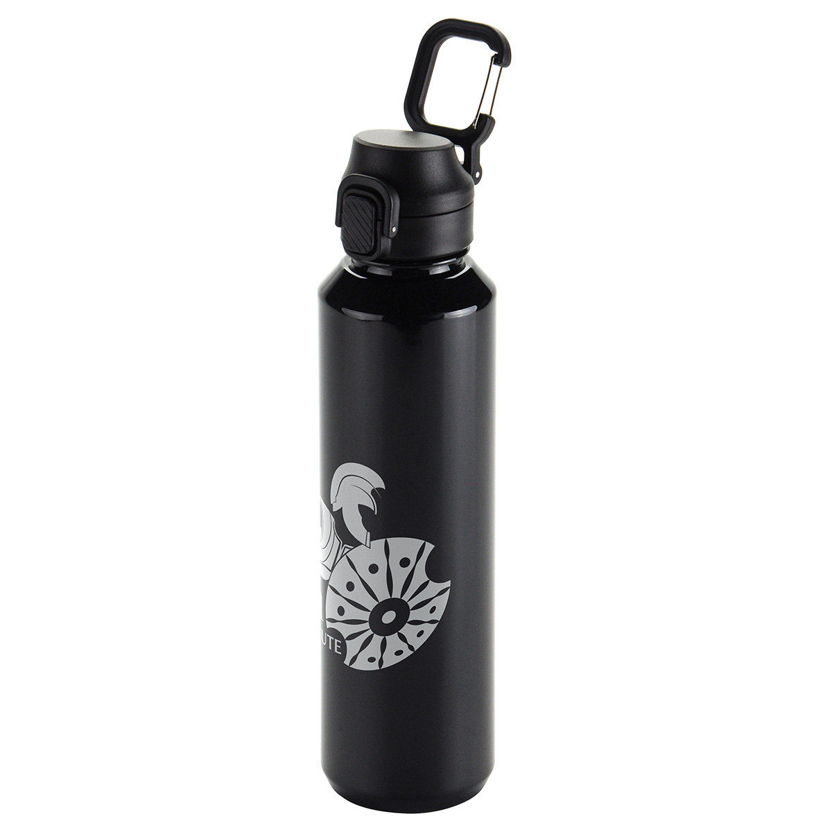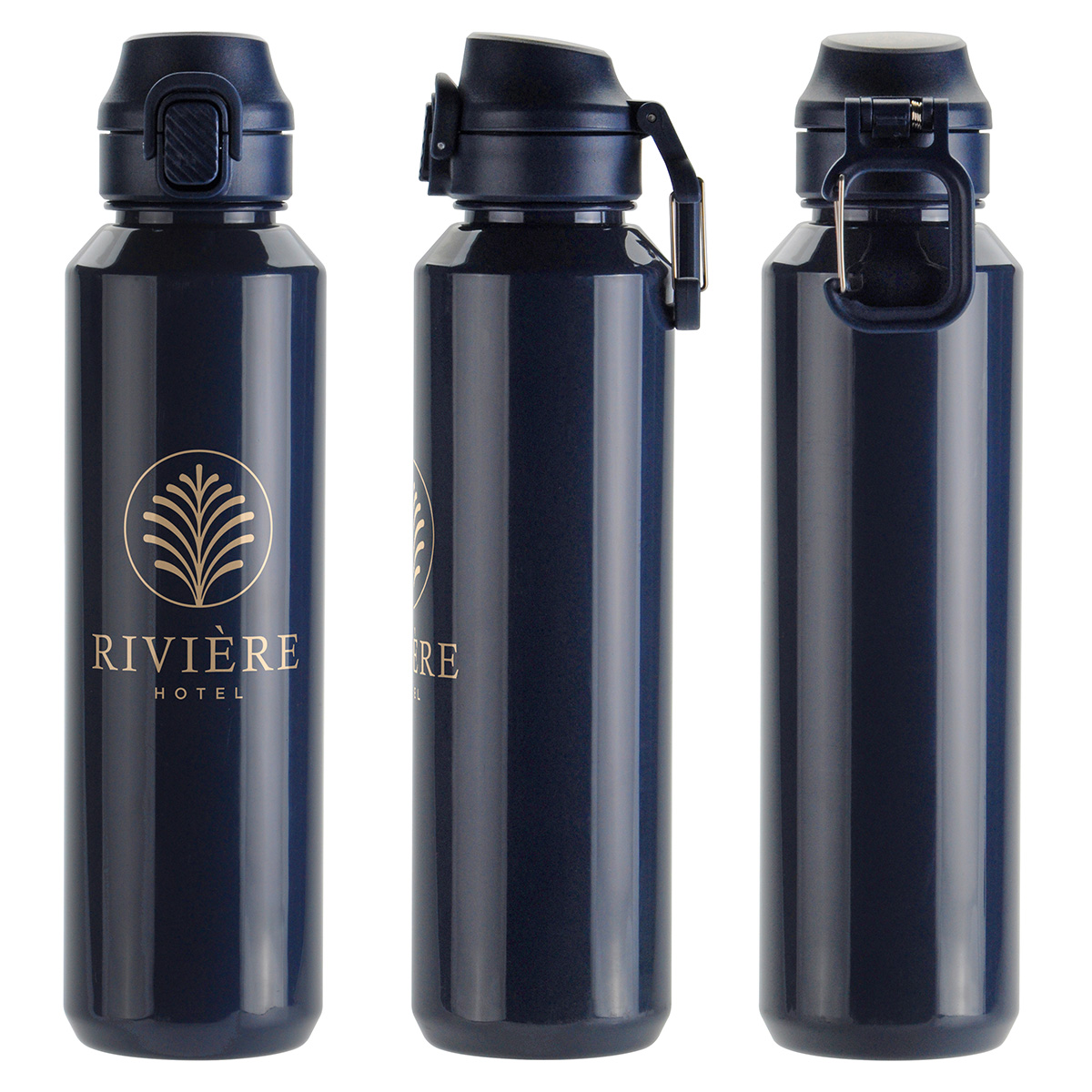 Quench your thirst with our Switchback 27 oz RPET Bottle with Snap-Top Lid & Carabiner, designed for both style and functionality. Featuring a convenient snap-top lid for easy access and a carabiner for attaching to backpacks for portability, it keeps beverages hot or cold for up to 3 hours. Made from BPA-free materials and FDA certified for safety, this bottle is perfect for everyday use. Hand wash only.