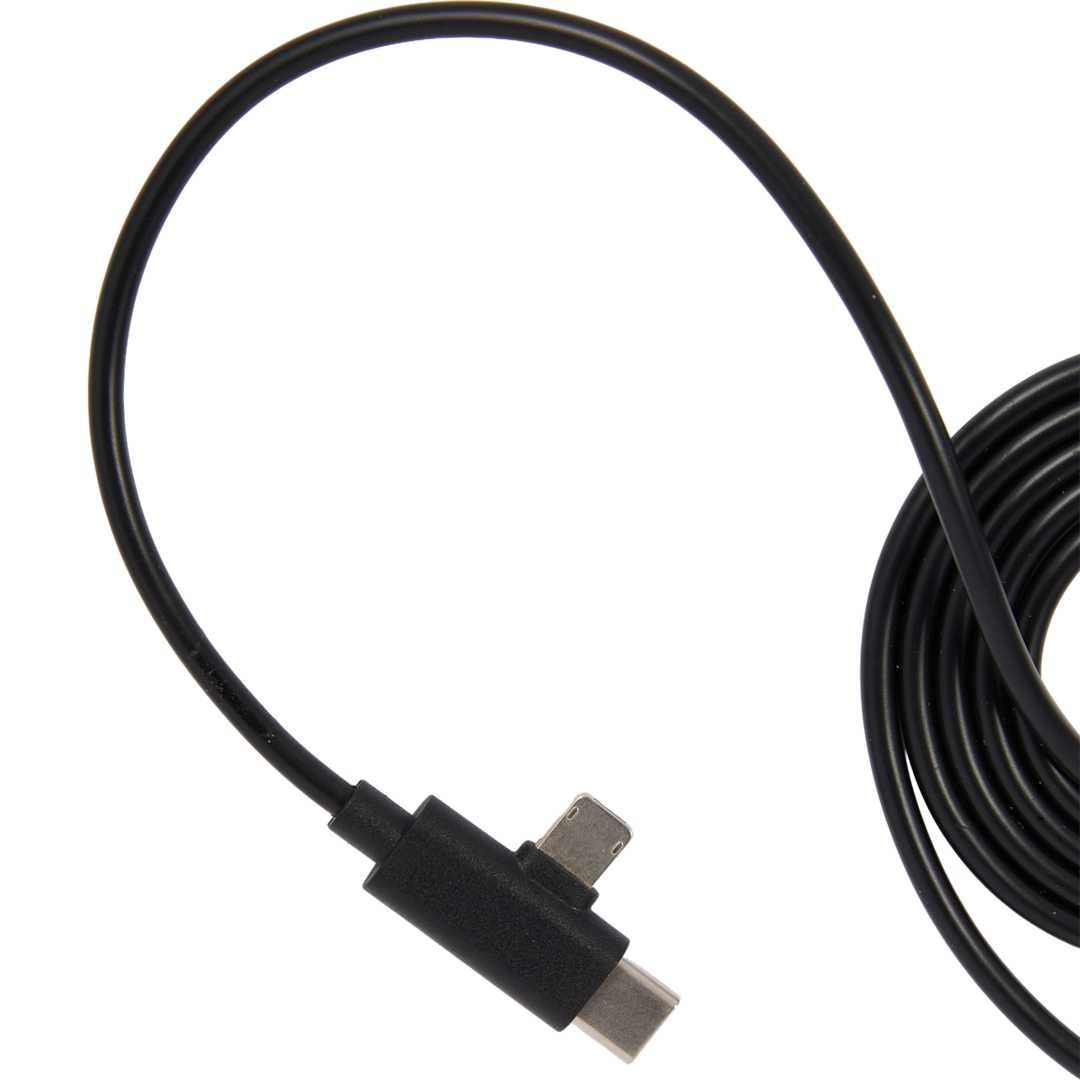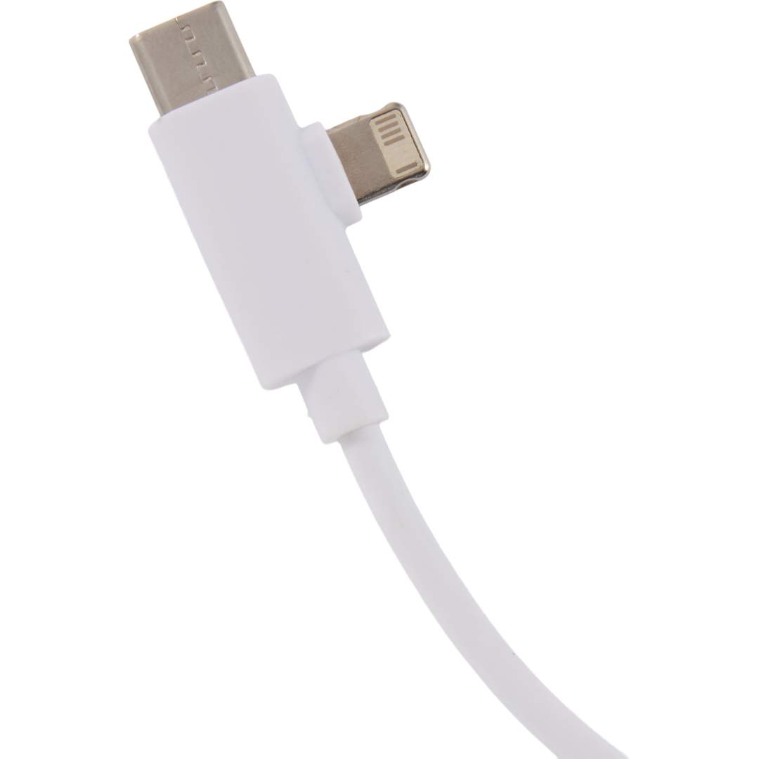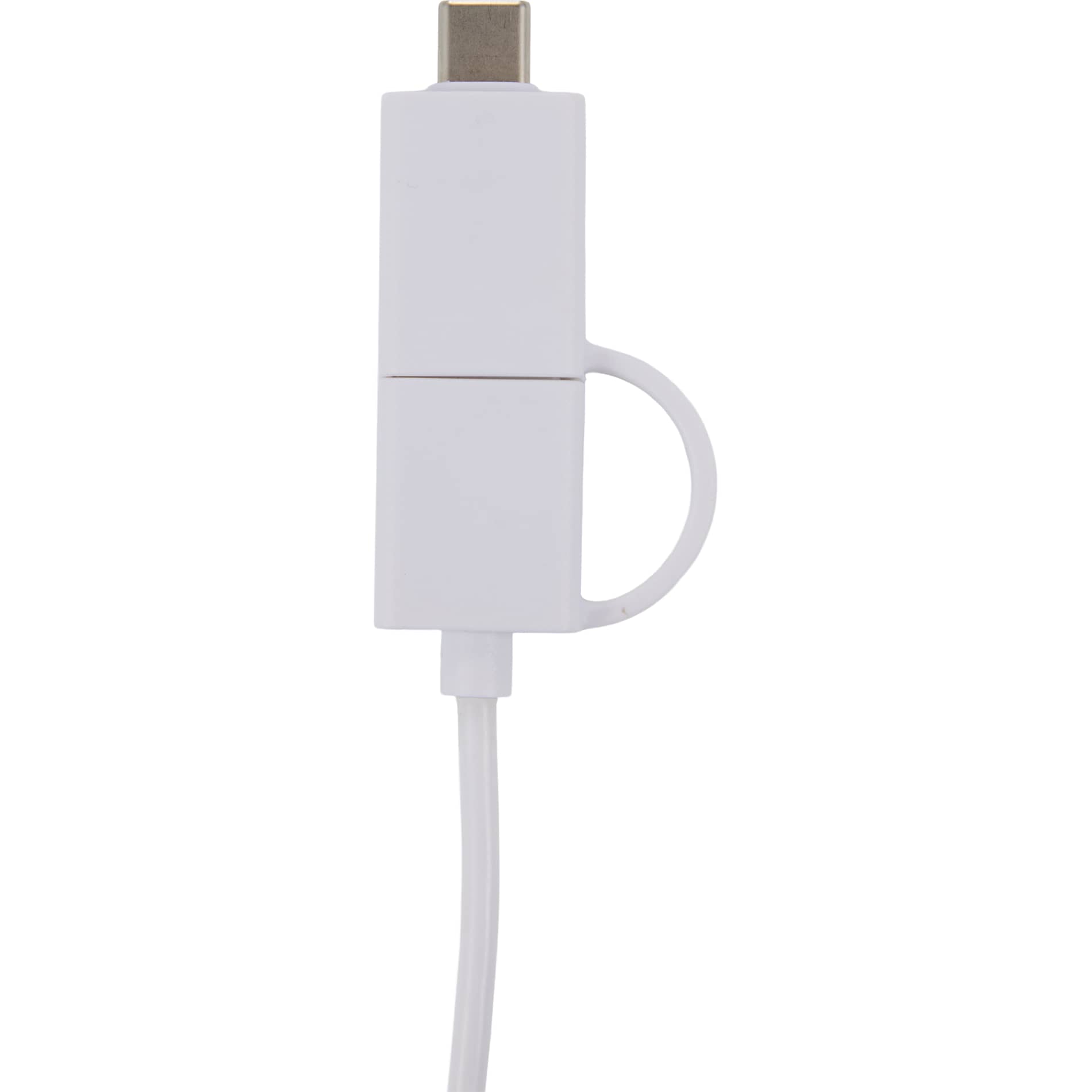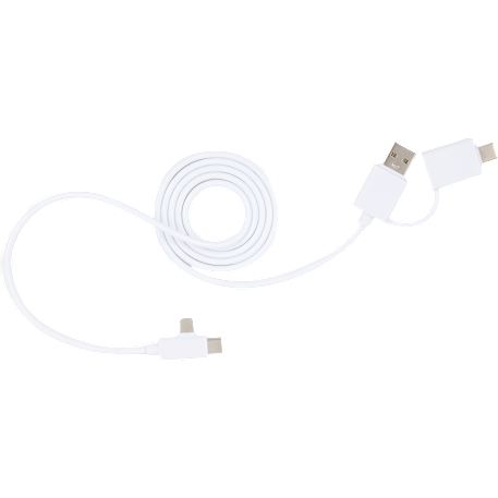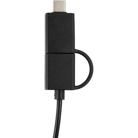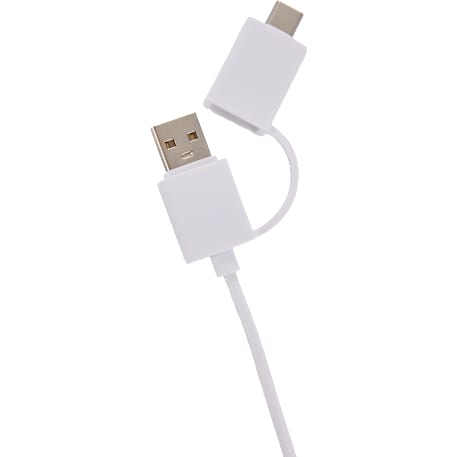 The 5-in-1 Recycled Long Charging Cables features 39-inch long, with a USB Type-A input adapter and a USB Type-C input tip at one side, and the other side with a Type-C output tip and a two-in-one dual compatible tip for both Apple iOS and Android devices (up to 5V/2A, 10W charging speed). It is recommended to use an AC adapter, power bank or car charger to charge devices, instead of using outputs from laptop or computer as power source.