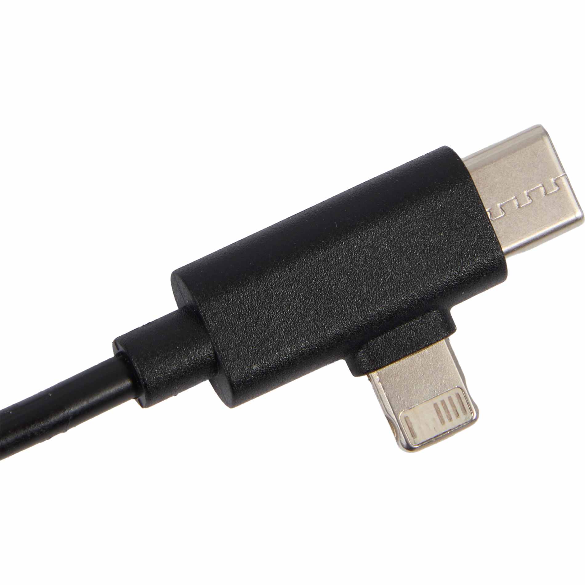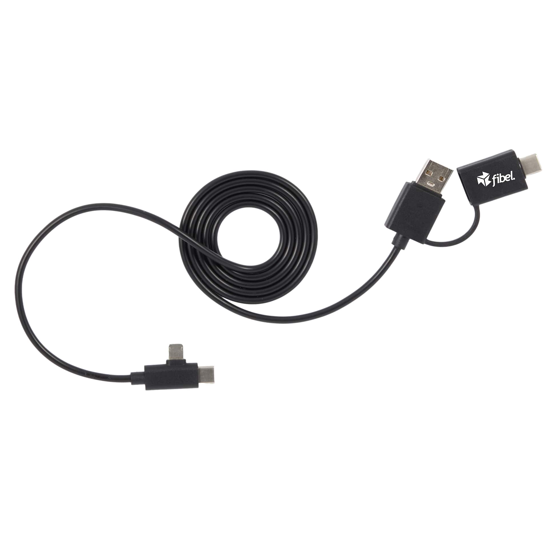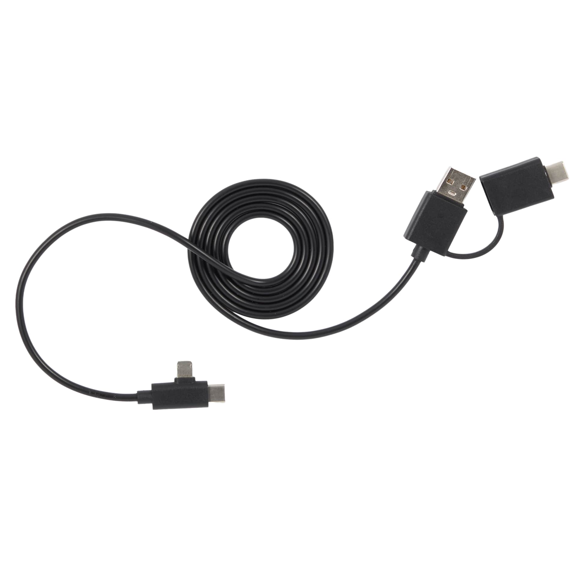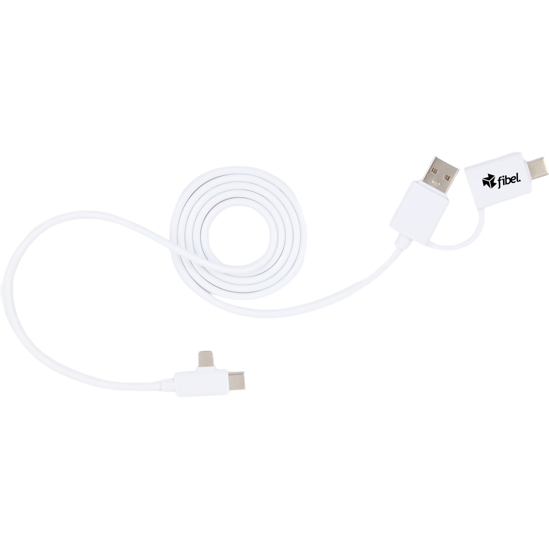 The 5-in-1 Recycled Long Charging Cables features 39-inch long, with a USB Type-A input adapter and a USB Type-C input tip at one side, and the other side with a Type-C output tip and a two-in-one dual compatible tip for both Apple iOS and Android devices (up to 5V/2A, 10W charging speed). It is recommended to use an AC adapter, power bank or car charger to charge devices, instead of using outputs from laptop or computer as power source.