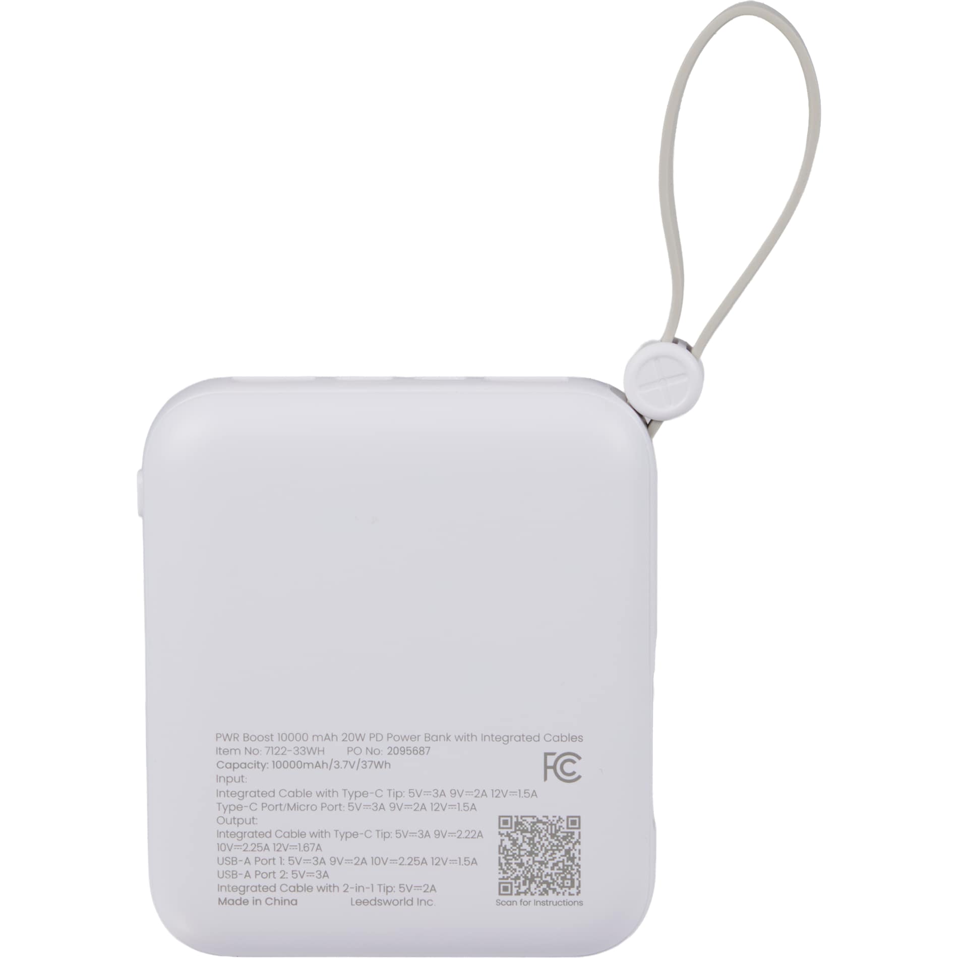 The PWR Boost 10,000 mAh 20W PD Power Bank with Cables features a digital power display, a 10,000 mAh/37Wh rechargeable lithium battery, and one Type-C Input port, one micro-USB input port, and two USB-A Output Ports. It also includes an integrated cable with Type-C tip that can be both input(5V/3A, 9V/2A, 12V/1.5A, 18W) and output(5V/3A, 9V/2.22A, 10V/2.25A, 12V/1.67A, 20W) and another integrated cable with 2-in-1 tip compatible with iPhone 14 series and below at 5V/2A/10W max charging speed. The power bank itself can be recharged through the integrated cable with a Type-C tip or your own cable with a Type-C tip or Micro tip. Type-C Input Port & Micro Input Port: 5V/3A, 9V/2A, 12V/1.5A (18W max); USB-A Output Port 1: 5V/3A, 9V/2A, 10V/2.25A, 12V/1.5A (18W max); USB-A Output Port 2: 5V/3A (18W max); Power banks are permitted in carry-on luggage only and at the discretion of TSA agents. Please charge the power bank before initial use.