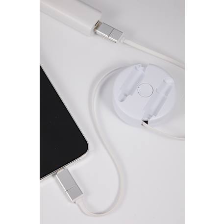 The Spinner 5-in-1 40W PD Charging Cable can be extended to 36'' long and includes a USB Type-A adapter and a USB Type-C input tip on one side. The other side includes a two-in-one dual compatible adapter for both Apple iOS and Android devices (up to 9V/2A, 18W charging speed), a USB Type-C output tip. Compatible for iPhone 15 Series, Android phones with Type-C port, even iPads/tablets with Type-C port. By using Type-C to Type-C type with appropriate AC adapter, it can reach up to 20V/2A, 40W. It also can be spun freely and smoothly to help with relieving stress when cable is stored properly. It features casing crafted from 100% recycled materials. It is recommended to use an AC adapter, power bank or car charger to charge devices, instead of using outputs from laptop or computer as power source.