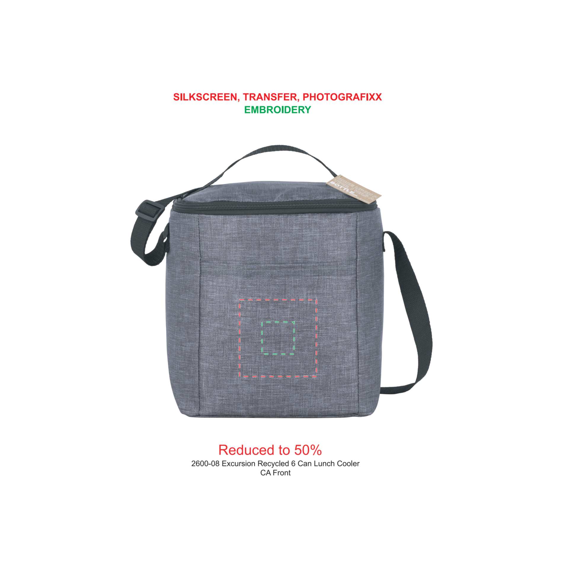 The Excursion Recycled 6 Can Lunch Cooler is stylish and ideally sized for anyone. Adjustable straps make it easy to carry, and the front pocket provides easy access. Best of all: It's made with recycled materials!