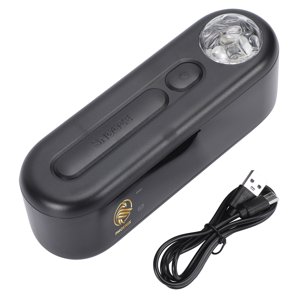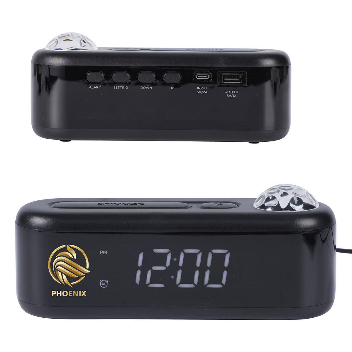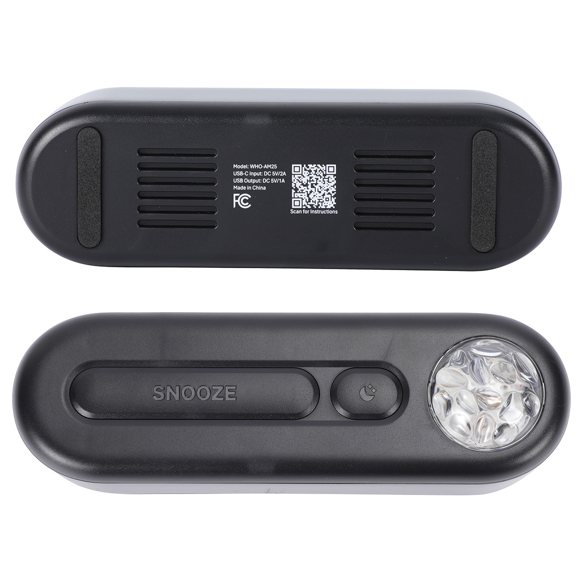 Wake up refreshed with this Ambiance Digital Alarm Clock with Ocean & Aurora Ceiling Projection, a digital alarm clock, displaying time, day, date, and temperature. Transform your room with its light prism, projecting mesmerizing ocean waves on the ceiling in 6 vibrant modes. A QR code is printed on each item and/or gift box providing access to the latest user manual. A USB output port allows device charging via cable. Includes a 39-inch USB to USB-C charging cable. Perfect for a soothing and functional bedside setup!