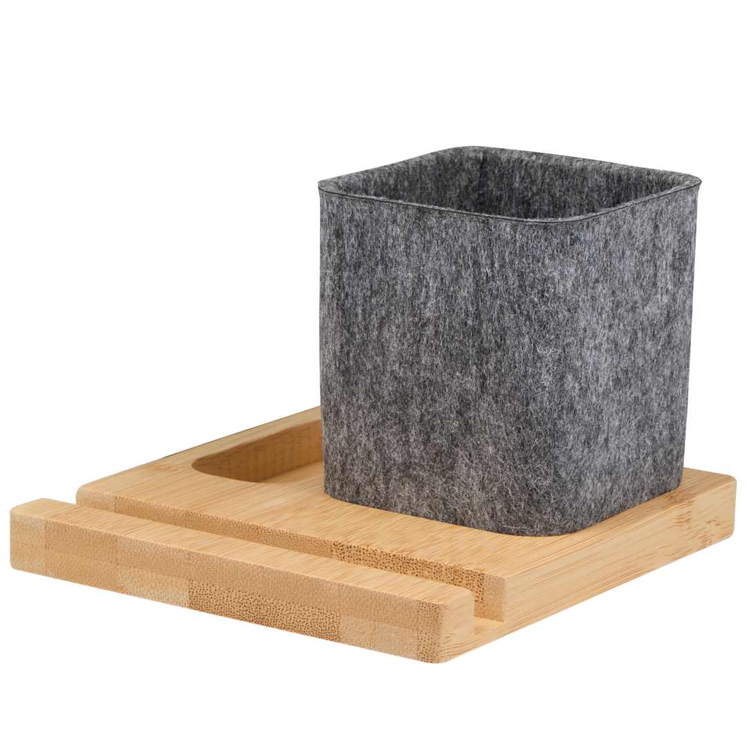 The Recycled Felt & Bamboo Pen Holder is a functional and stylish addition to any workspace. Featuring an FSC® certified bamboo organizer tray with a removable recycled felt pen cup, this organizer is designed to keep your desk neat and efficient. The bamboo tray includes two small compartments, one for desk accessories and another perfectly sized for the pen cup. A front slot provides additional utility, holding your phone, sticky notes, or writing tools. Combining sustainability with aesthetics, this pen holder is both practical and visually appealing.