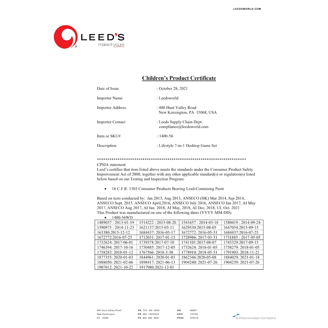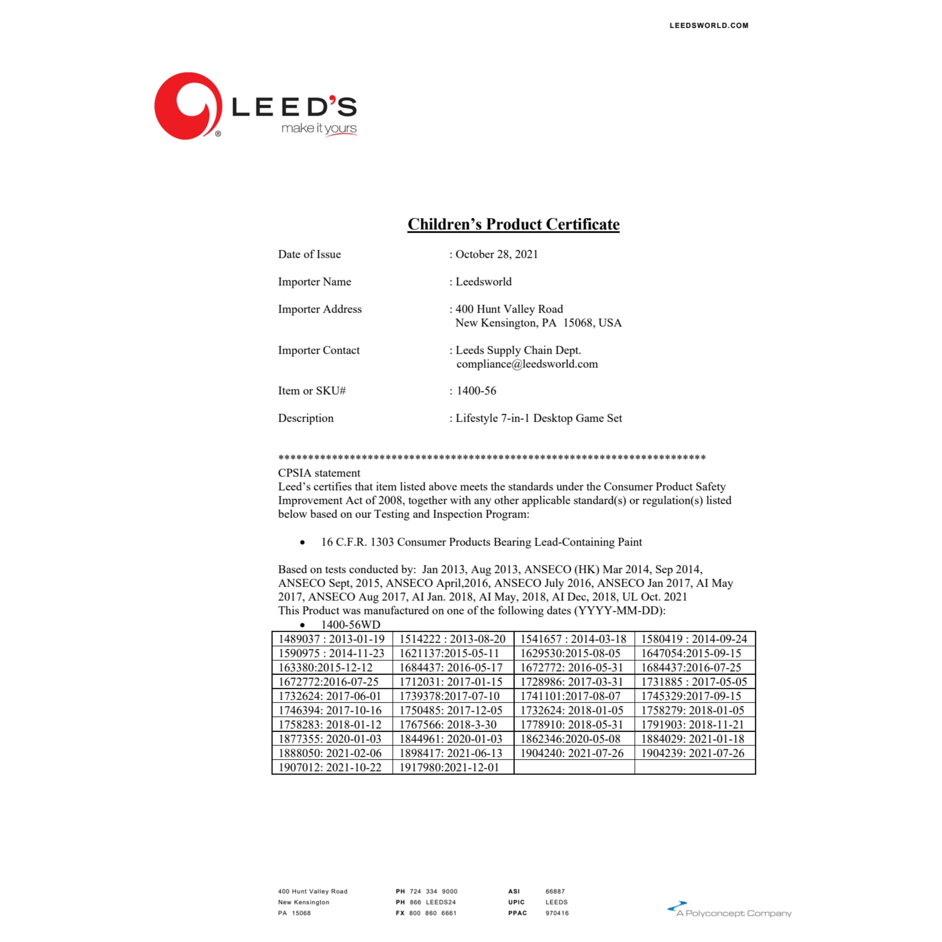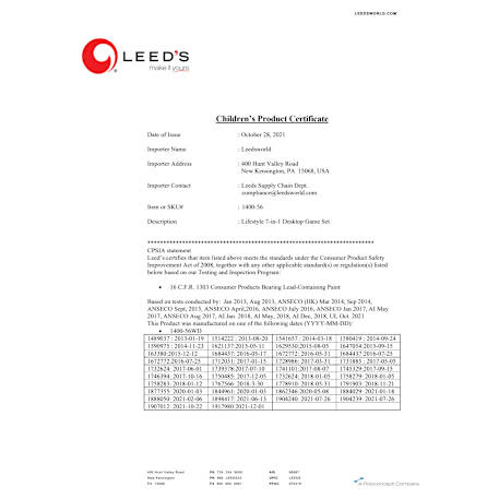 Set includes game boards (on both sides of the lid) and game pieces for checkers, chess and backgammon, 28 dominoes, cribbage board and pegs, a standard deck of cards, four dice, and an instruction booklet. All components store neatly in wooden case. Leed's products are not designed for use by, or intended for children ages 12 and under.