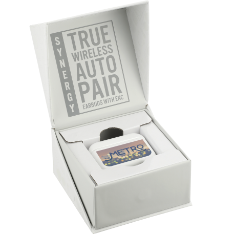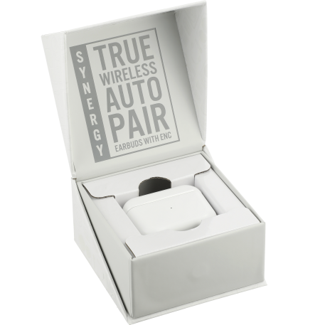 The Synergy True Wireless Auto Pair Earbuds with ENC feature the latest technology in audio. Once the case is opened, the earbuds will power on and automatically sync to one another. The case also doubles as a power bank for the earbuds and can be charged with the included Type-C cable. Once the 400mAh battery of the case is charged, it will charge the earbuds 4x from 0-100%. With over 4.5 hours of playback time at max volume on a single charge, they’re a must for any traveler or gamer. With built-in Environmental Noise Cancellation (ENC), the earbuds block out surrounding sounds and pick up only your voice when using them for calls or video games, making it easy for the other person to hear you. The earbuds have built-in music controls and dual microphones for hands-free operation. It takes 1.5 hours to fully charge the earbuds. The case can be charged in under 2 hours. Gaming mode: Low latency 70-75ms.