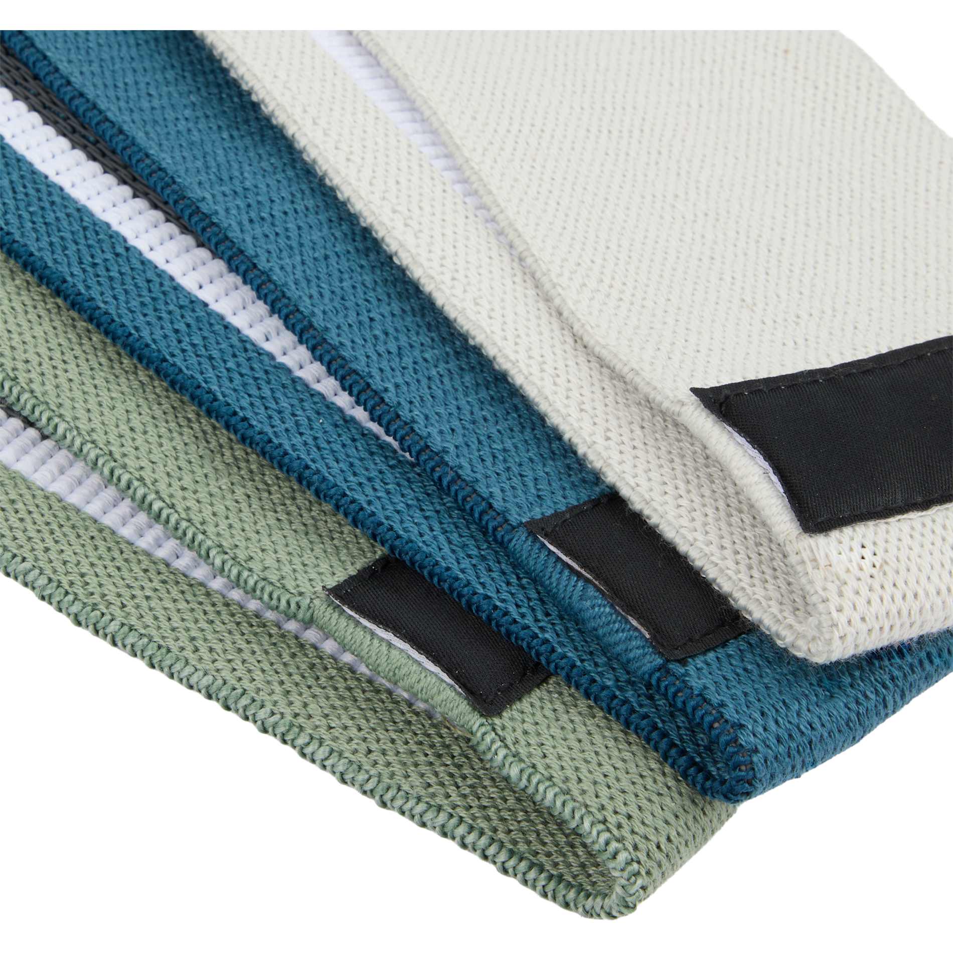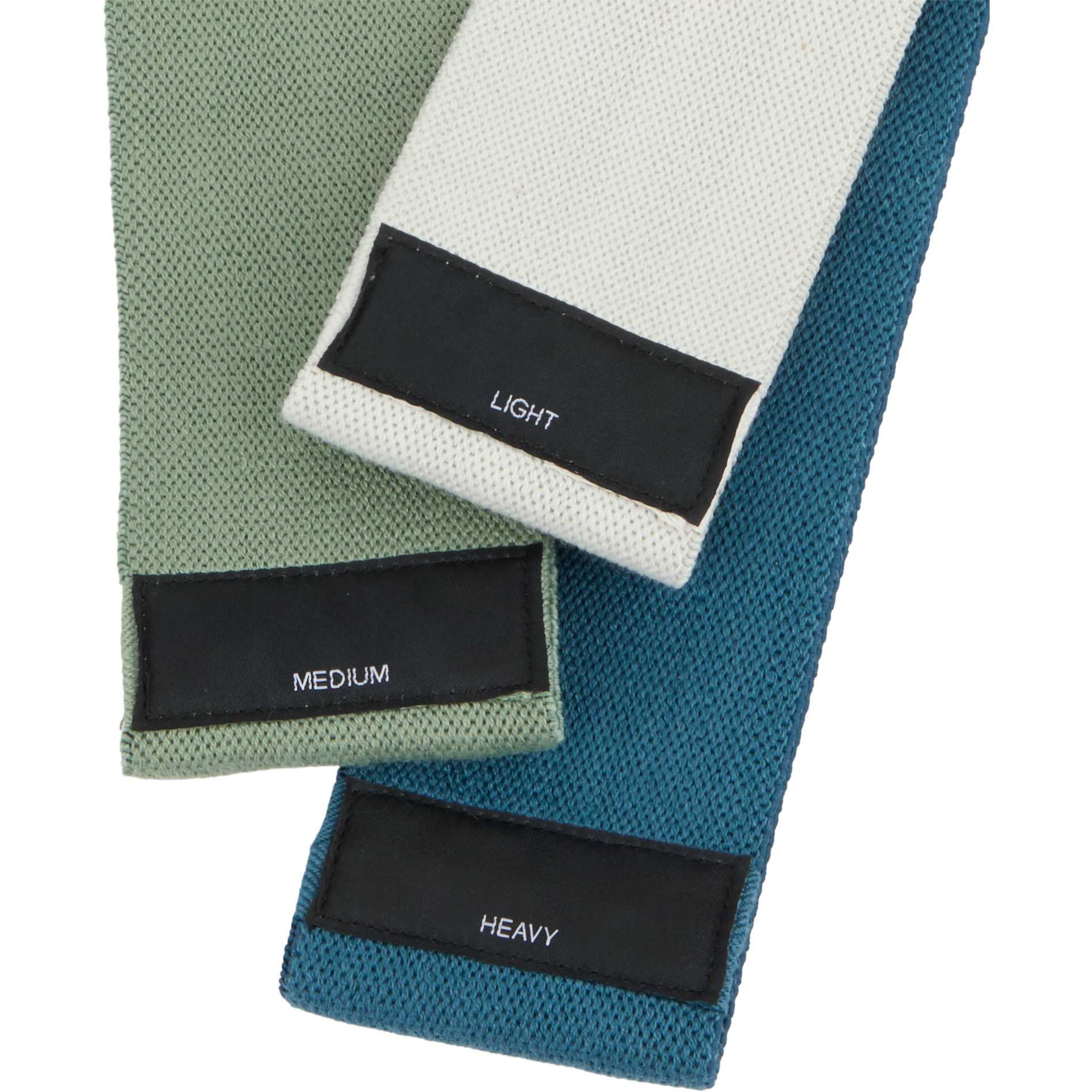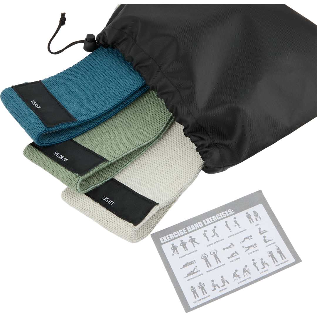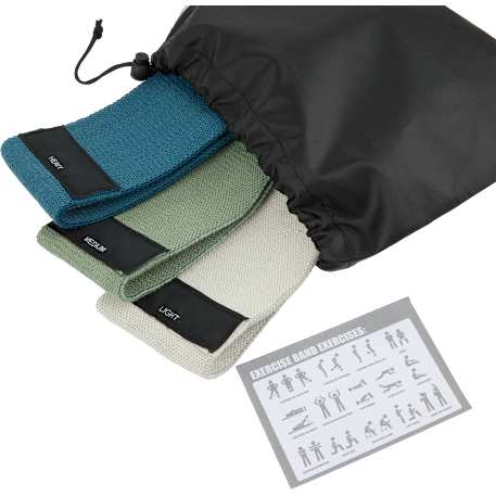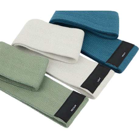 The Wellable Resistant Band Set includes 3, different colored fabric resistant bands. Bands range from light, medium and heavy resistance, and can easily be stored in the recycled pouch!