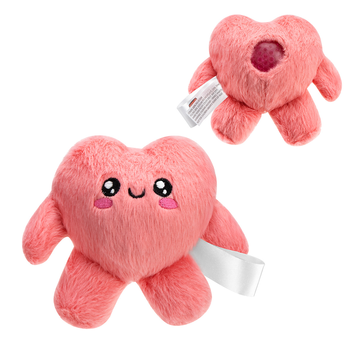 Clear thermal plastic rubber ball filled with colorful gel-filled beads, covered with a plush design in the shape of a fluffy heart. Beads inside give a massaging feel when squeezed out of cover. Ball retu s to original shape when released. Logo printed on white loop for a retail finish.