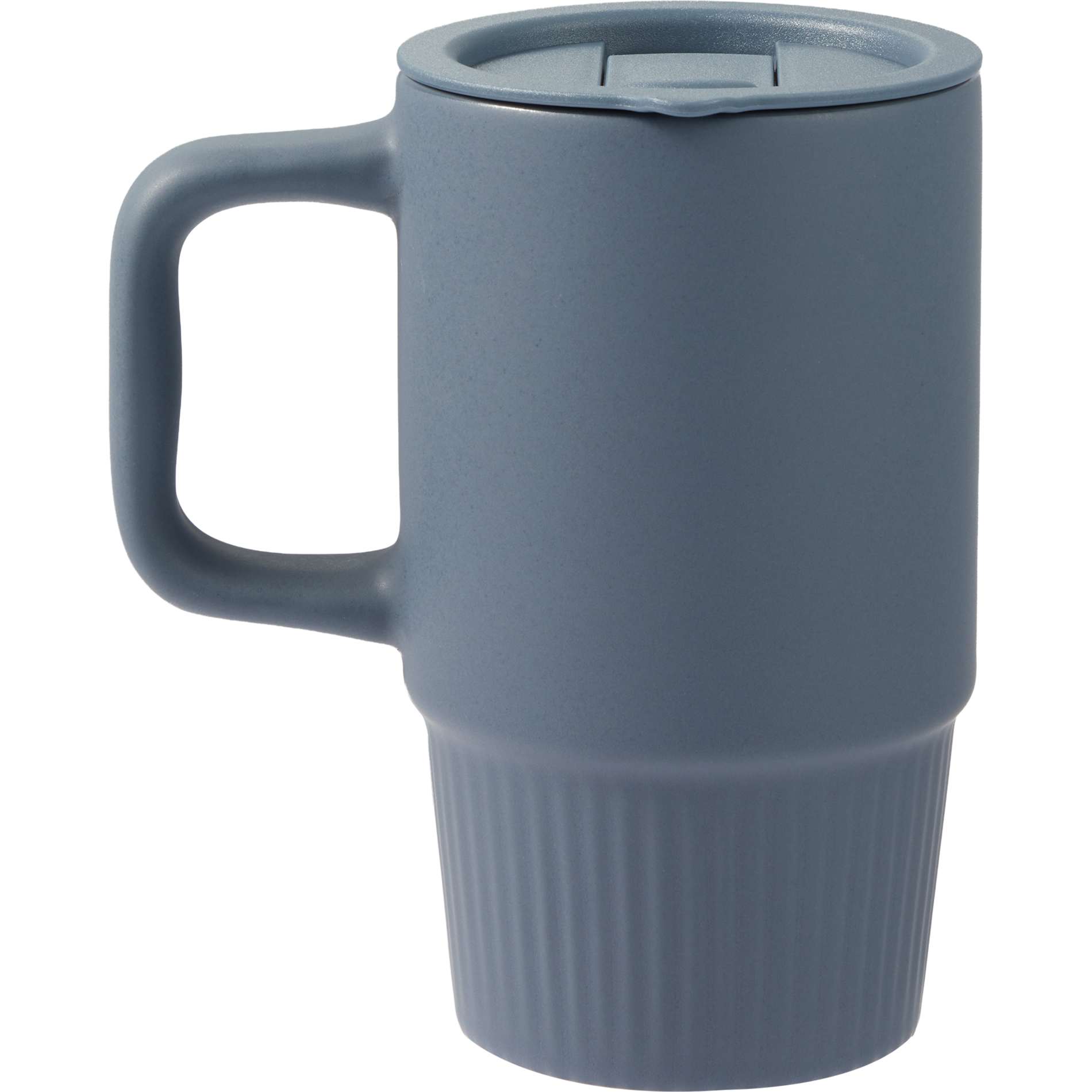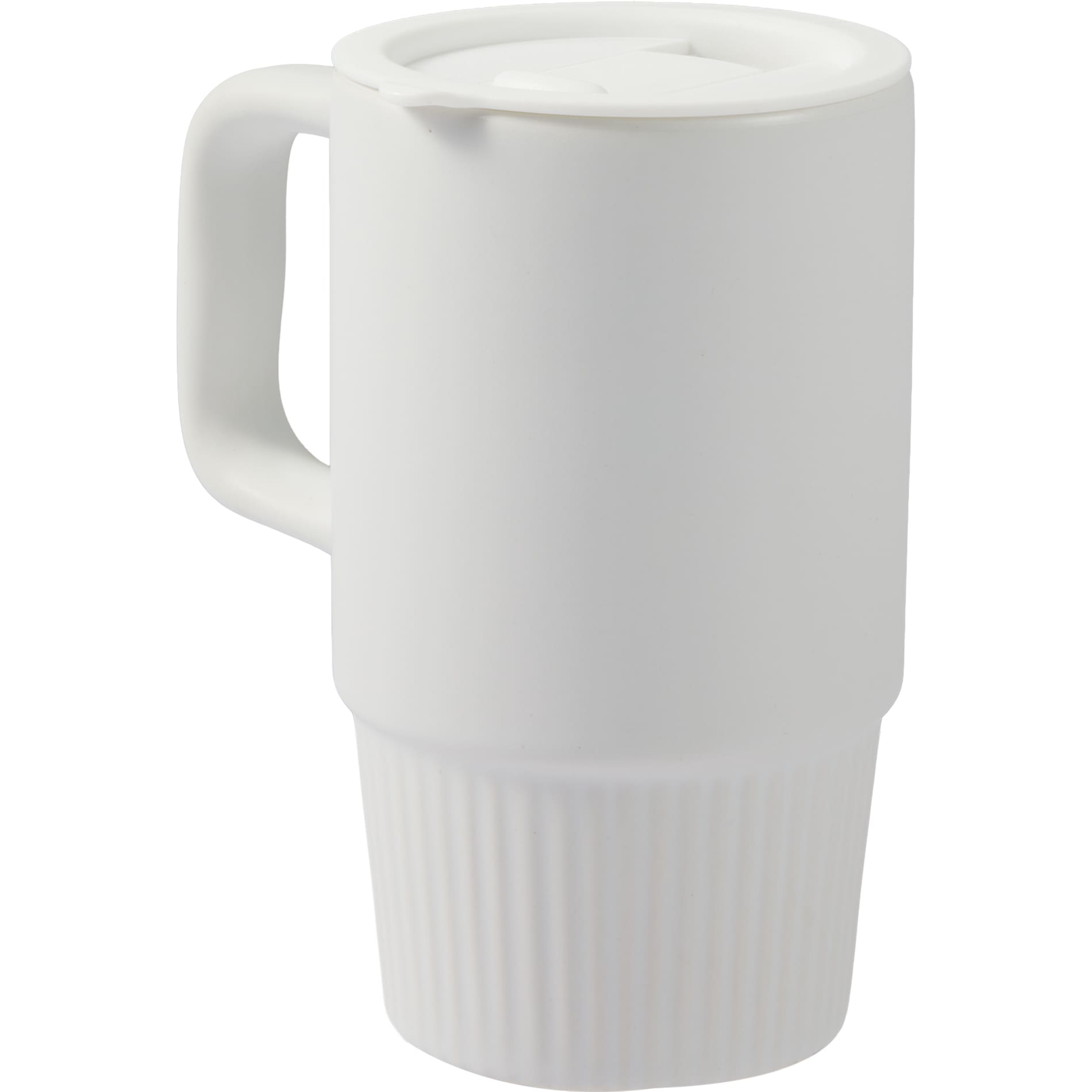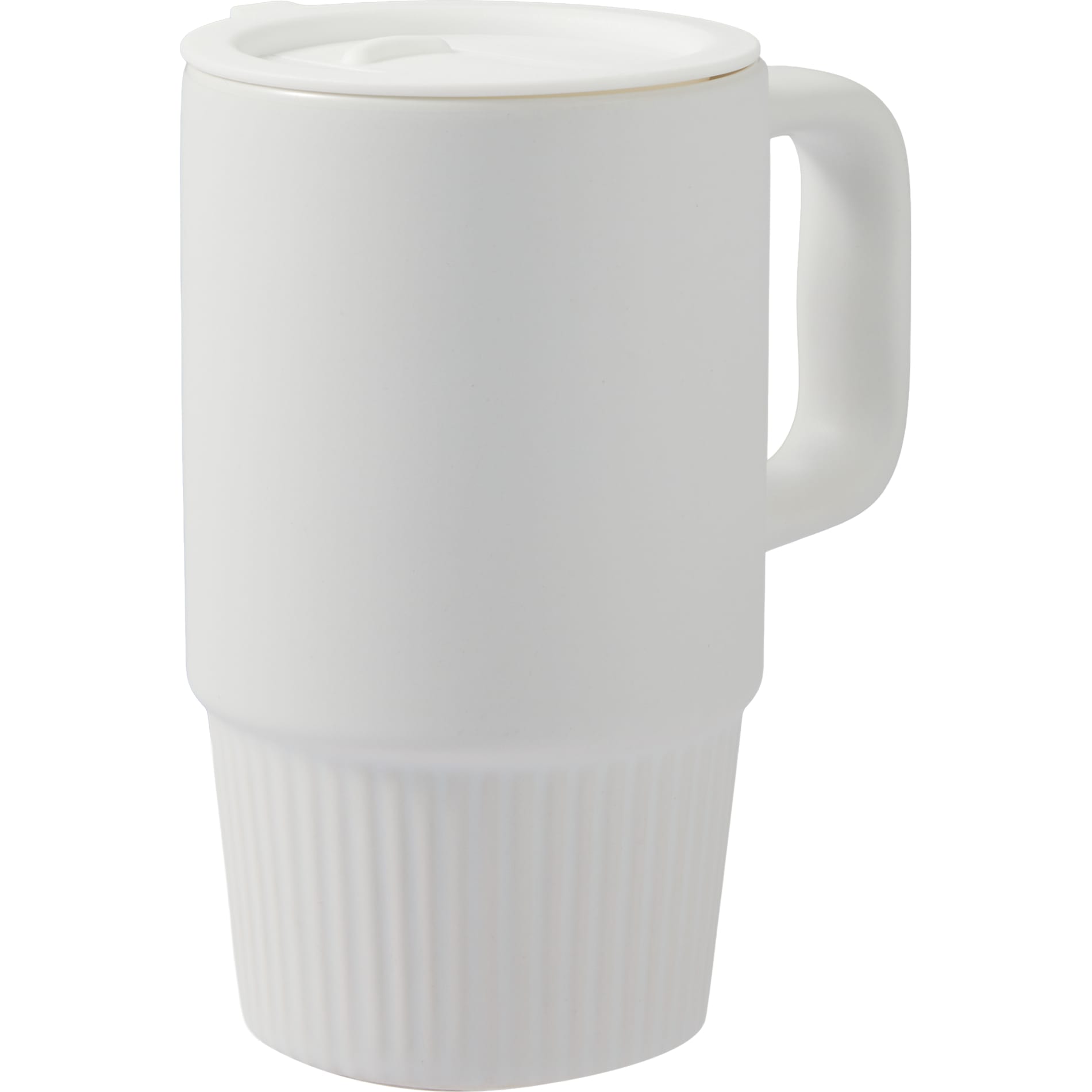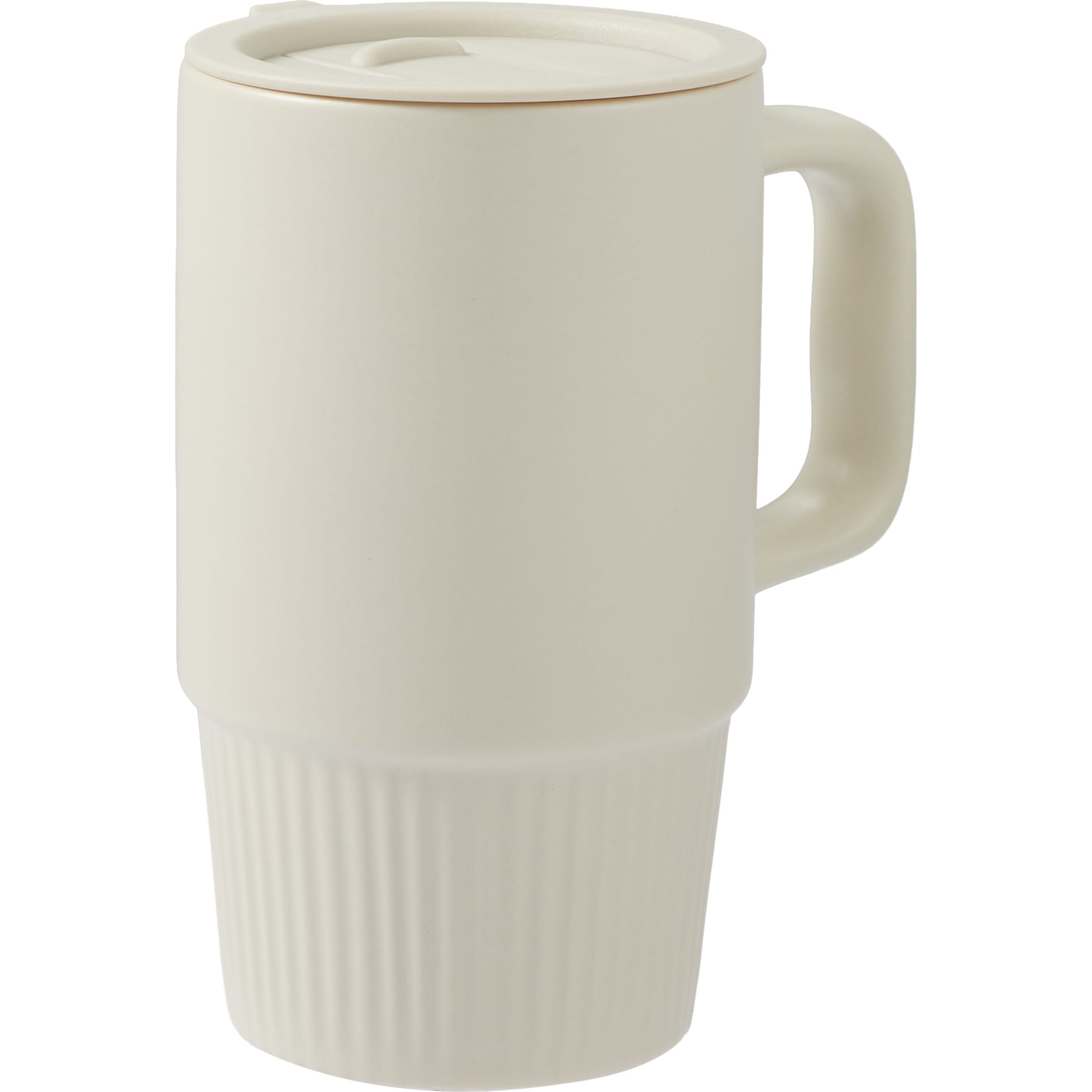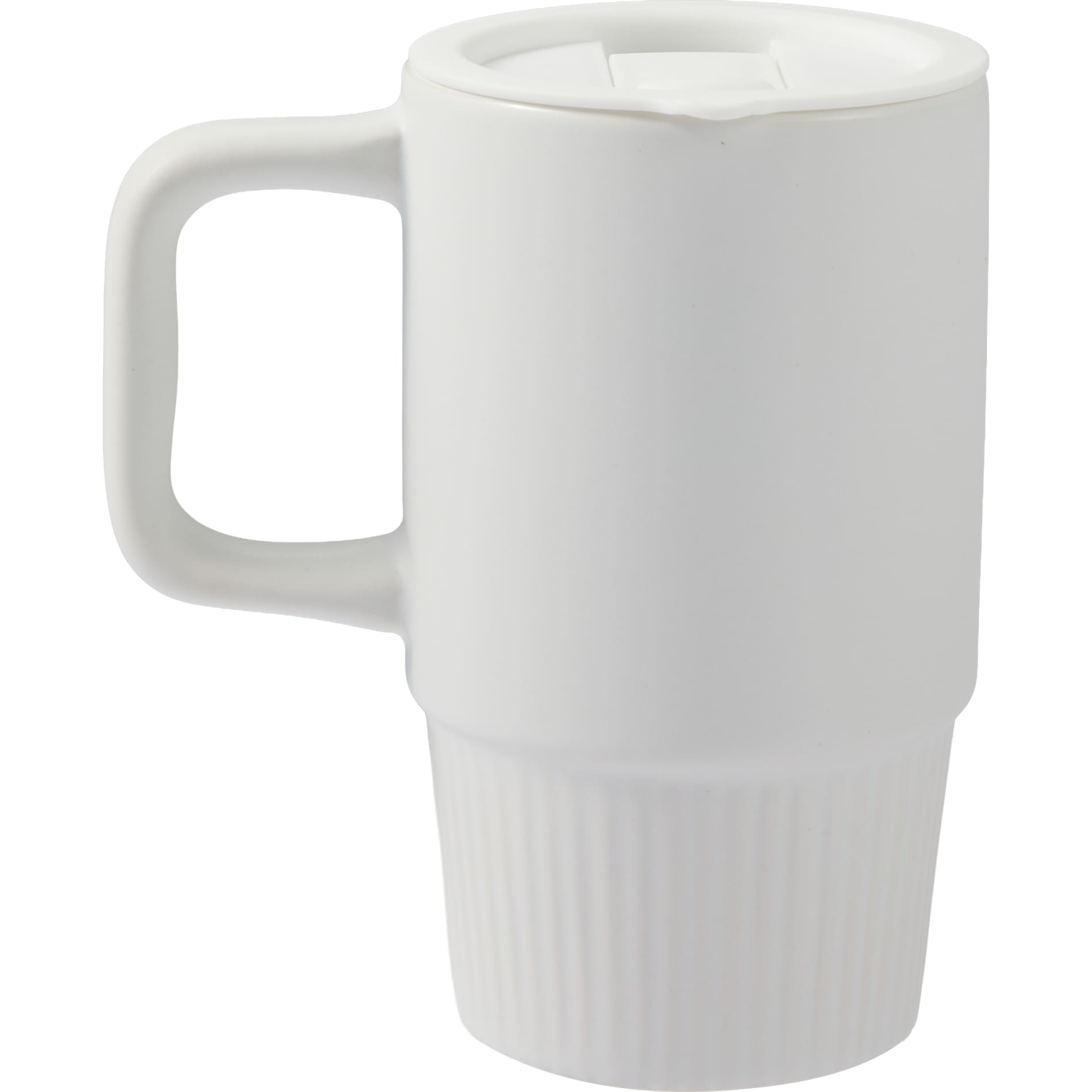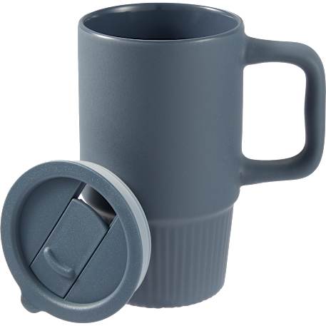 Check this mug out! intrdoucing Camden 13oz Ceramic Mug w/ Lid perfect for at the office or breakfast table the vertical lined patte on the bottom and wide handle is a great addition to your cupboard the slide lid will keep your bevrage hot and will prevent splashes. Hand wash