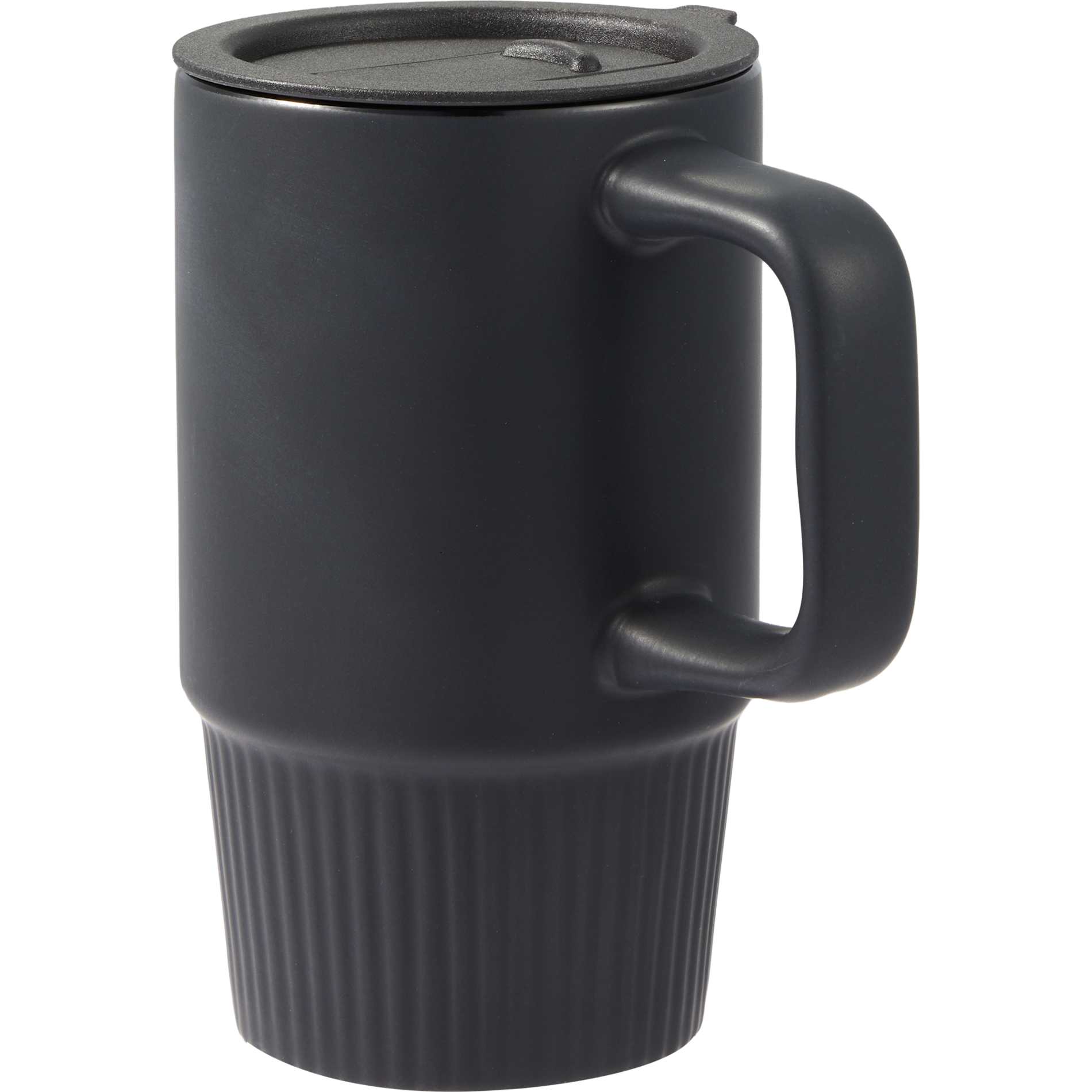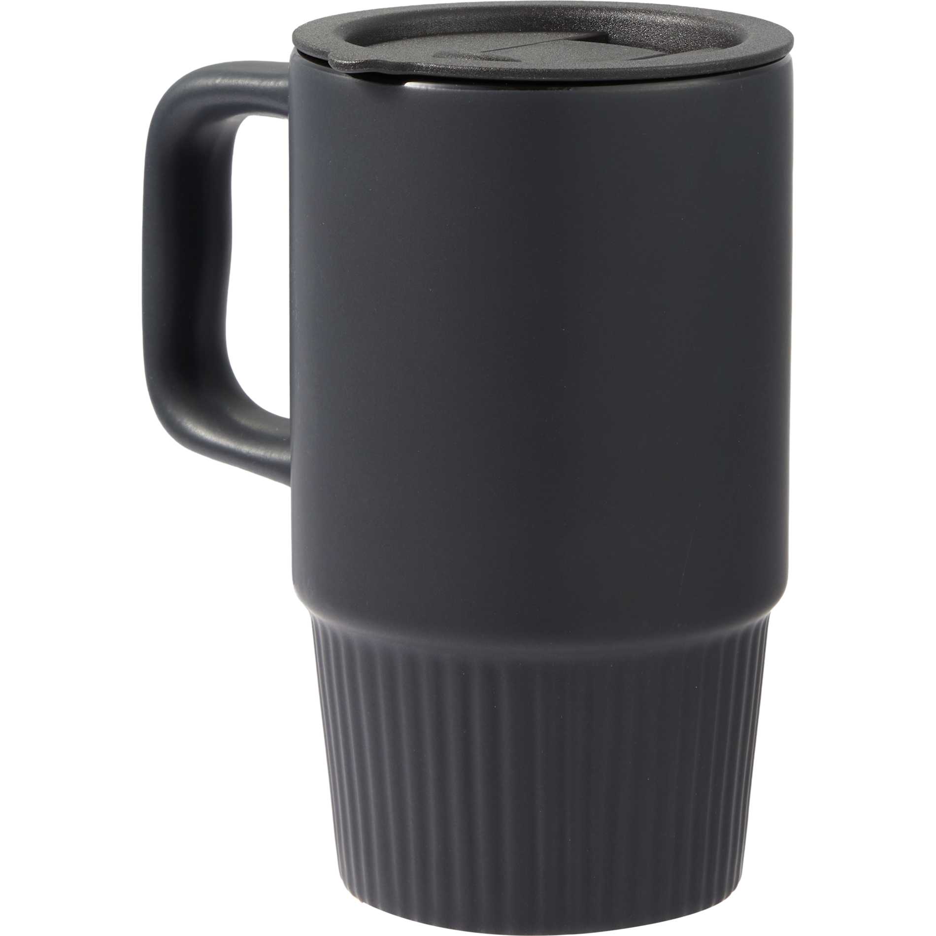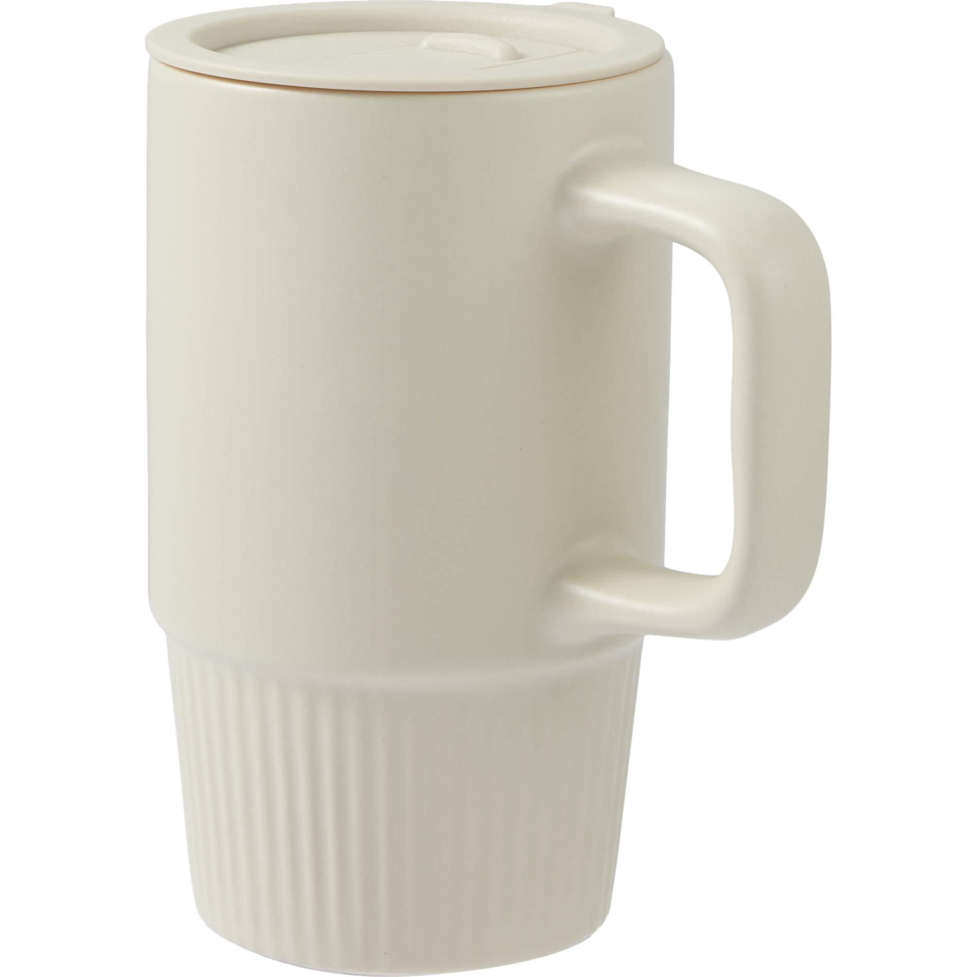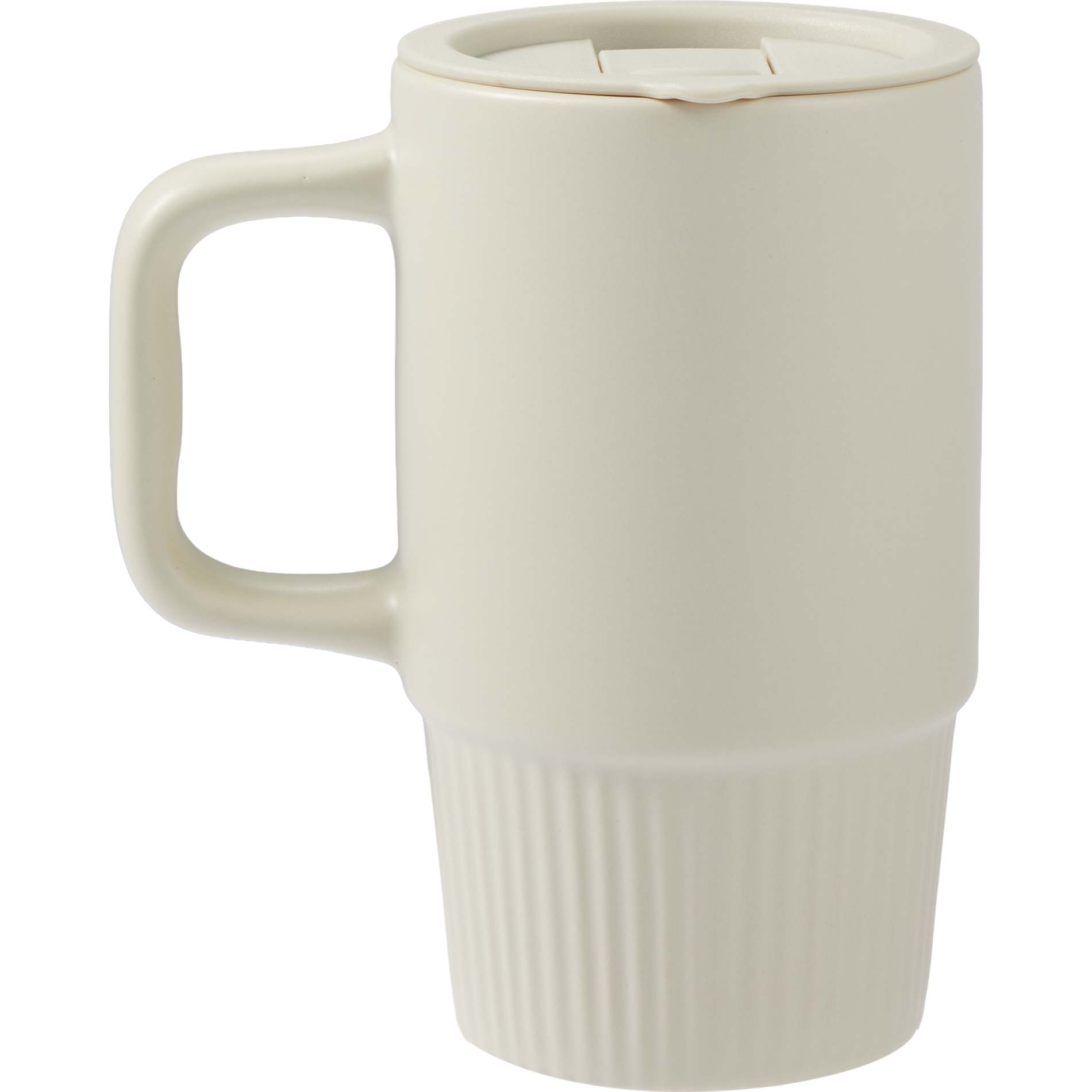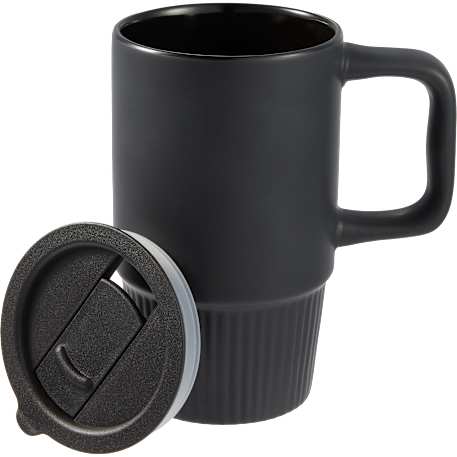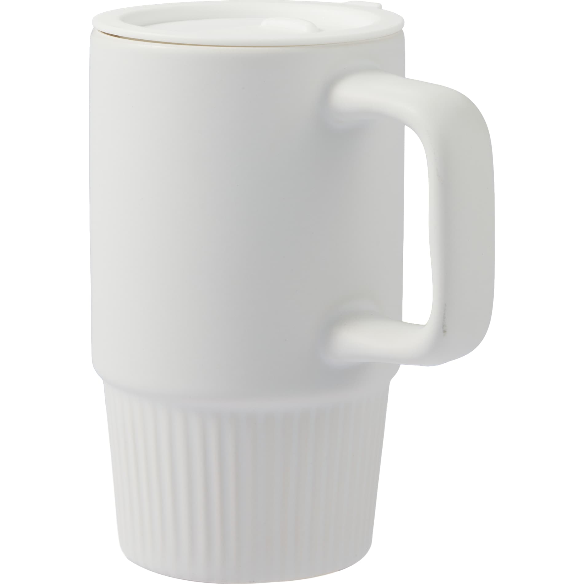 Check this mug out! intrdoucing Camden 13oz Ceramic Mug w/ Lid perfect for at the office or breakfast table the vertical lined patte on the bottom and wide handle is a great addition to your cupboard the slide lid will keep your bevrage hot and will prevent splashes. Hand wash