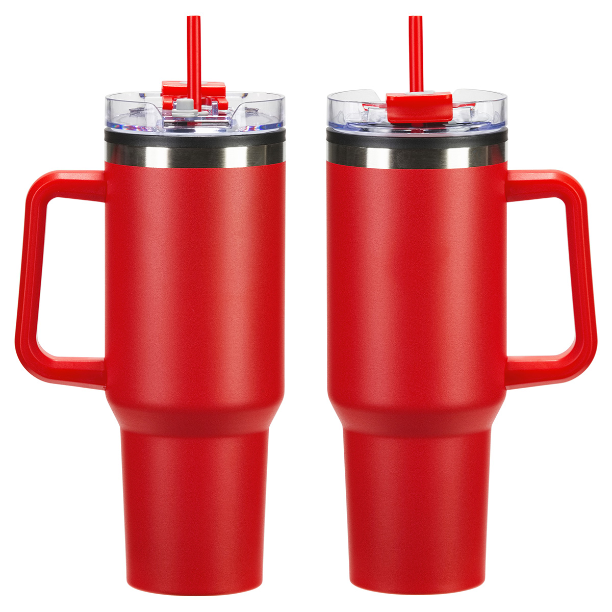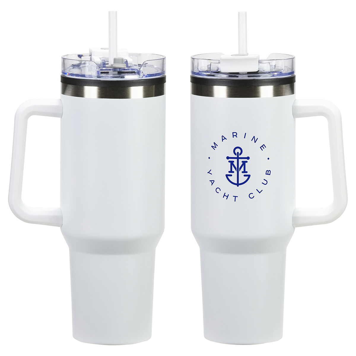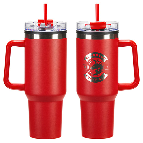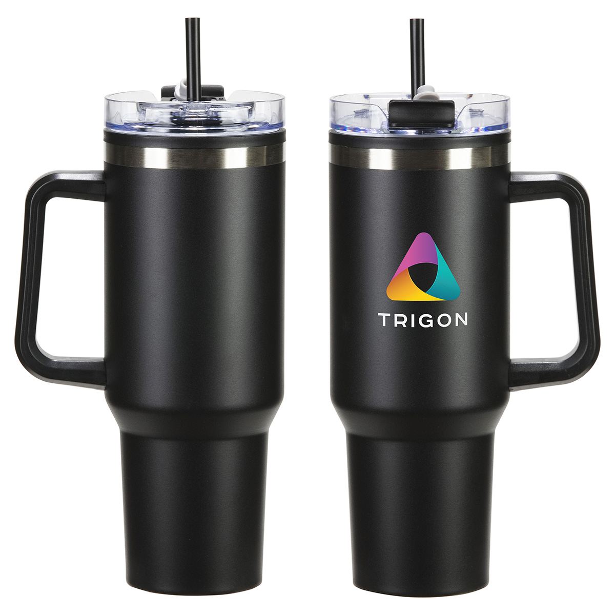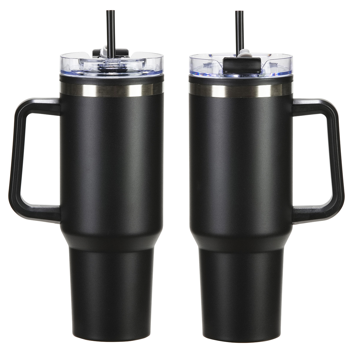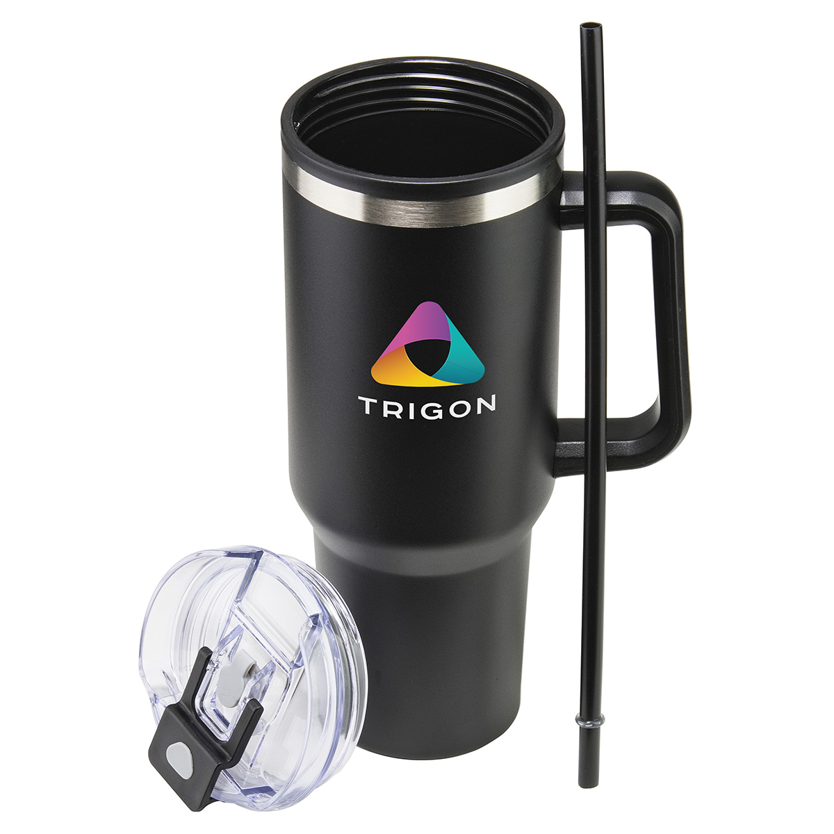 Enjoy the ultimate in hydration with our Ohana 40 oz Stainless Steel/Polypropylene Mug with Color-Matching Handle, featuring a sleek stainless steel outer shell and a black polypropylene inner lining. The clear screw-on plastic lid includes a leak-resistant high wall, ensuring no spills. Designed with a color matched plastic handle for easy carrying, this mug keeps beverages hot or cold for up to 3 hours. It's BPA-free and FDA certified for safety, making it perfect for everyday use. Hand wash only.