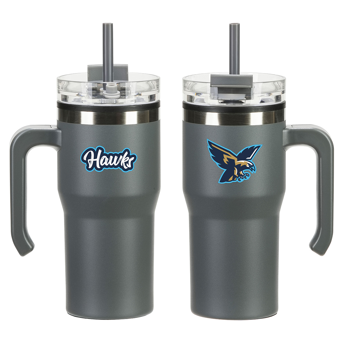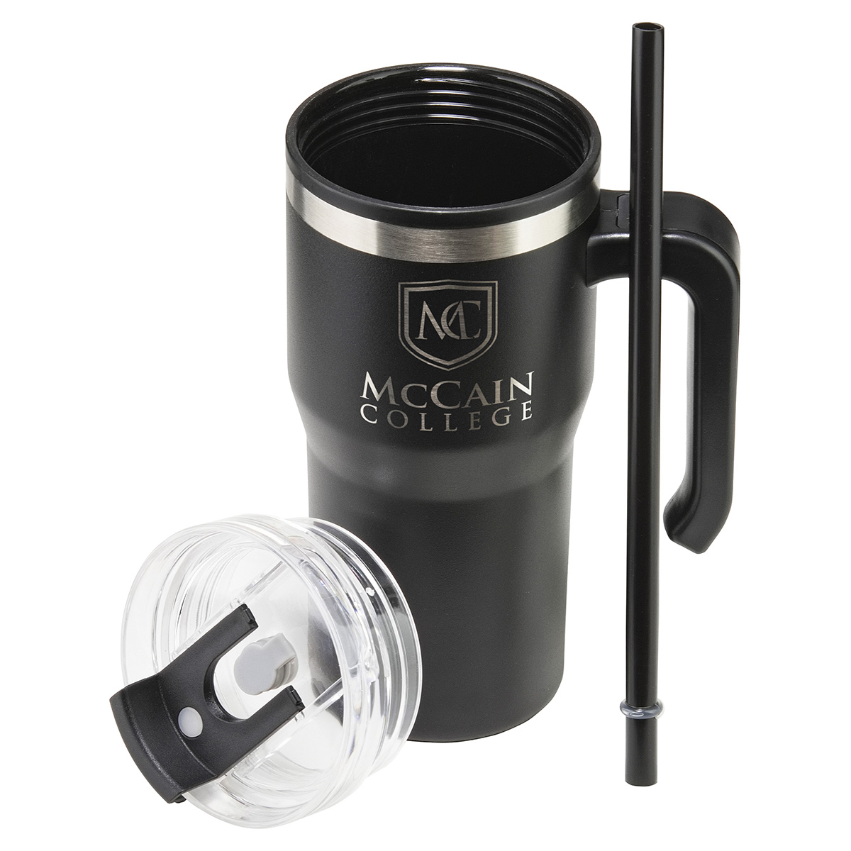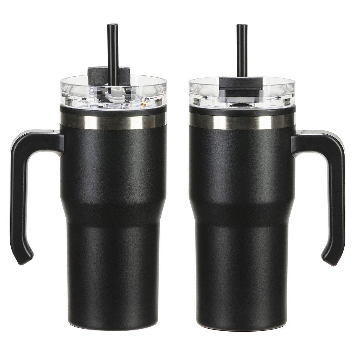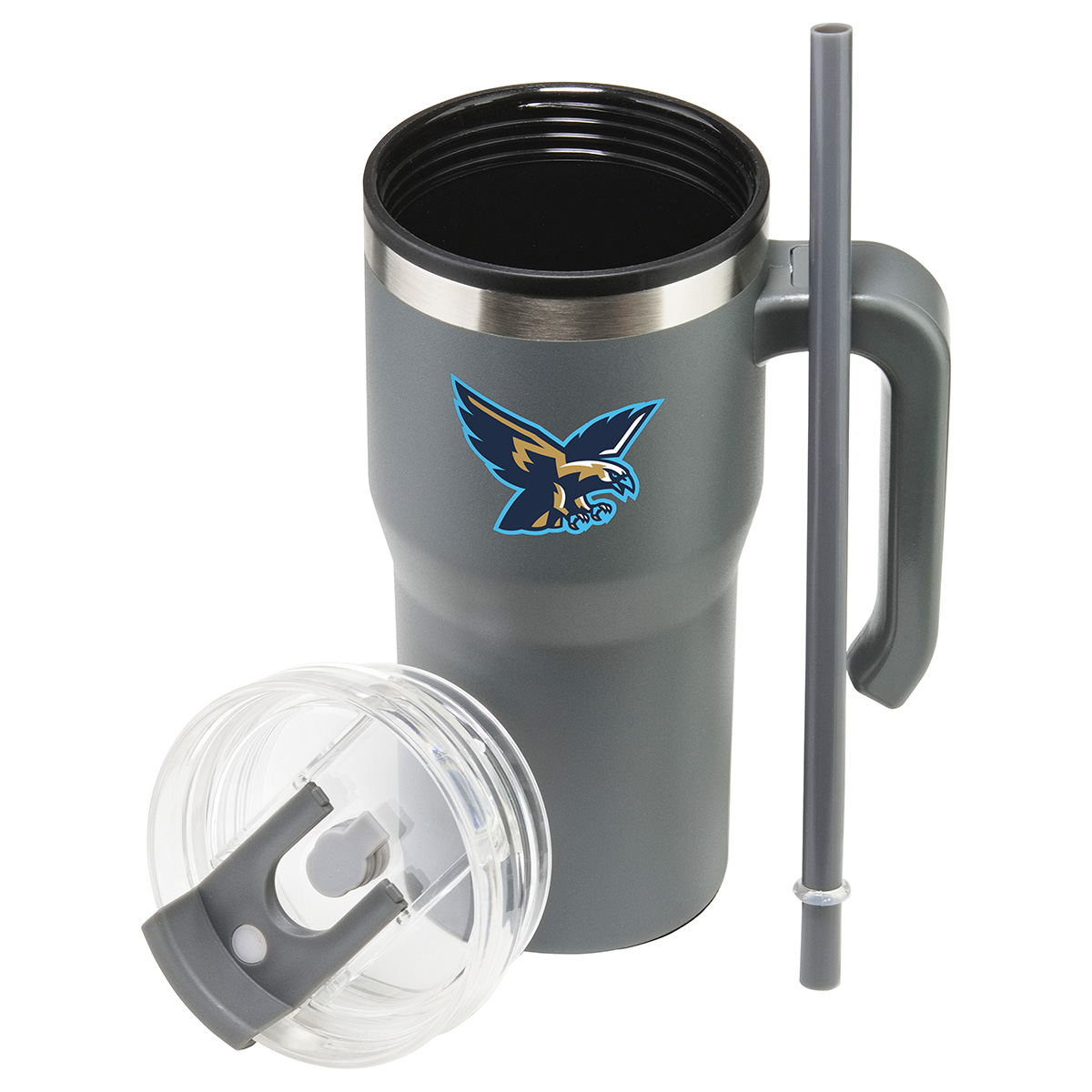 Experience ultimate hydration with our Outback 20 oz Stainless Steel/Polypropylene Mug with Lid and Straw, featuring a sleek stainless steel outer shell and a black polypropylene inner lining. The clear screw-on plastic lid includes a leak-resistant high wall, ensuring no spills. Designed with a color matched plastic handle for easy carrying, this mug keeps beverages hot or cold for up to 3 hours. It's BPA-free and FDA certified for safety, making it perfect for everyday use. Hand wash only to maintain its quality and performance.