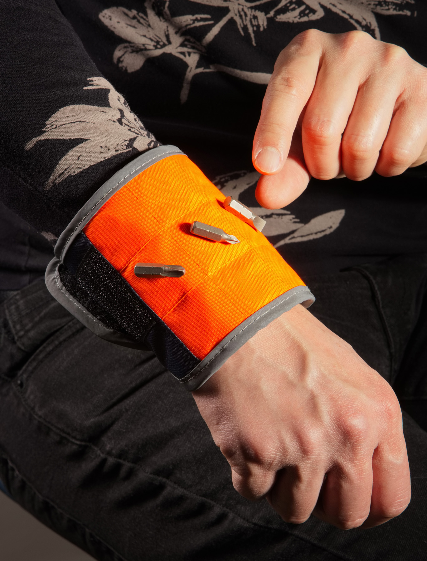 Keep your essential tools at your fingertips with our Handy Reach Magnetic Wrist Wrap For Tools! The magnetic wrist wrap keeps tools, screws, or nails within easy reach, featuring 9 strong magnets for secure holding. Designed with a high-visibility orange panel for added safety in work environments. The hook & loop adjustable closure ensures a secure and comfortable fit for various wrist sizes. Made of durable polyester, this versatile wrap is perfect for DIY projects, construction, and repairs, keeping essentials accessible while working hands-free.