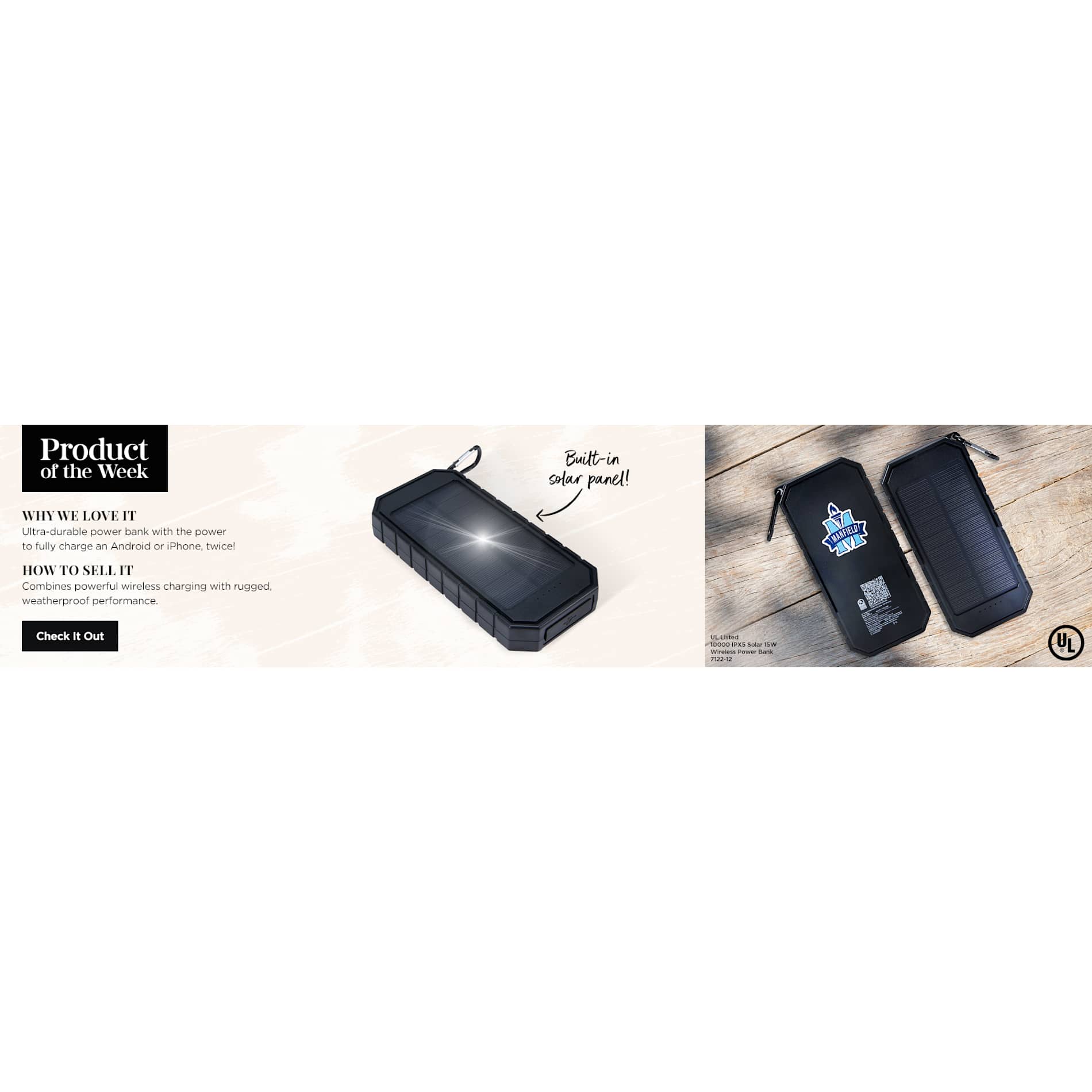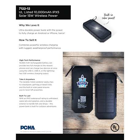 The UL Listed 10,000 IPX5 Solar 15W Wireless Power Bank is the ultimate on-the-go power solution. With a 10,000 mAh/37Wh rechargeable lithium polymer battery and a lightning-fast 15W wireless charging pad, it keeps your devices powered up effortlessly. Boasting versatile Type-C Input/Output and USB-A Output, it's compatible with a wide range of devices. Its built-in solar panel ensures you're never left powerless, while the included carabiner lets you conveniently attach it to your bag for easy access. Engineered with an IPX5 waterproof rating, it's ready to tackle any adventure. Included a 39-inch Type-C-to-Type-C charging cable and packaged in an FSC®-certified premium gift box. The color of the solar panel may vary from every batch. Power banks are permitted in carry-on luggage only, and at the discretion of TSA agents. Please charge power bank before initial use. The power bank will need 45 hours of direct sunlight to fully charge the power back through the solar panel only.