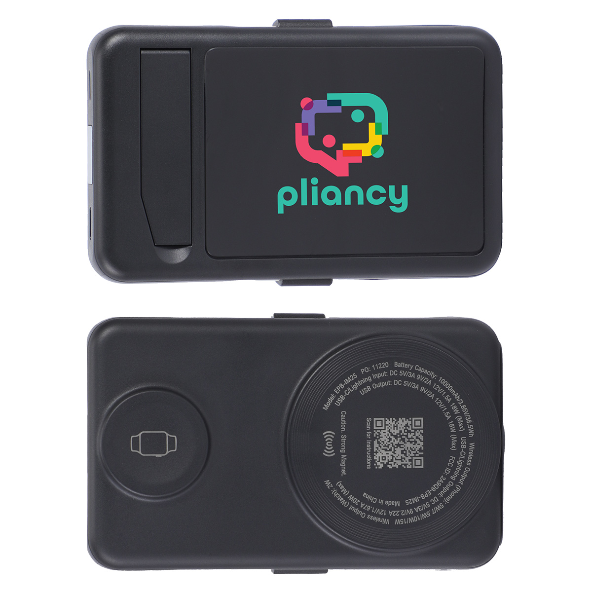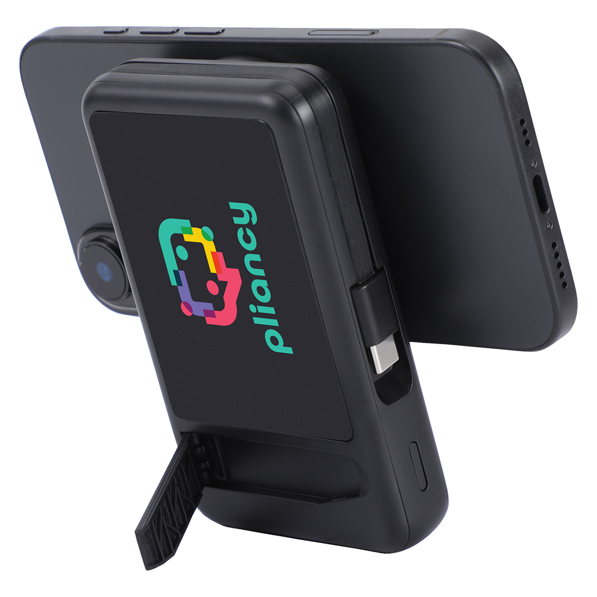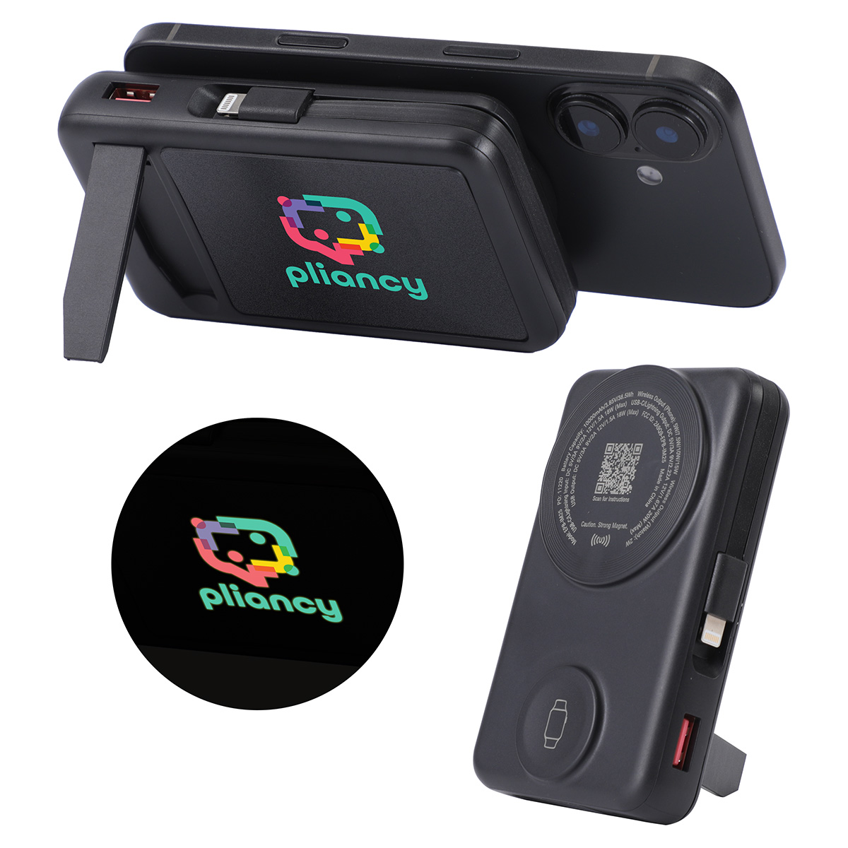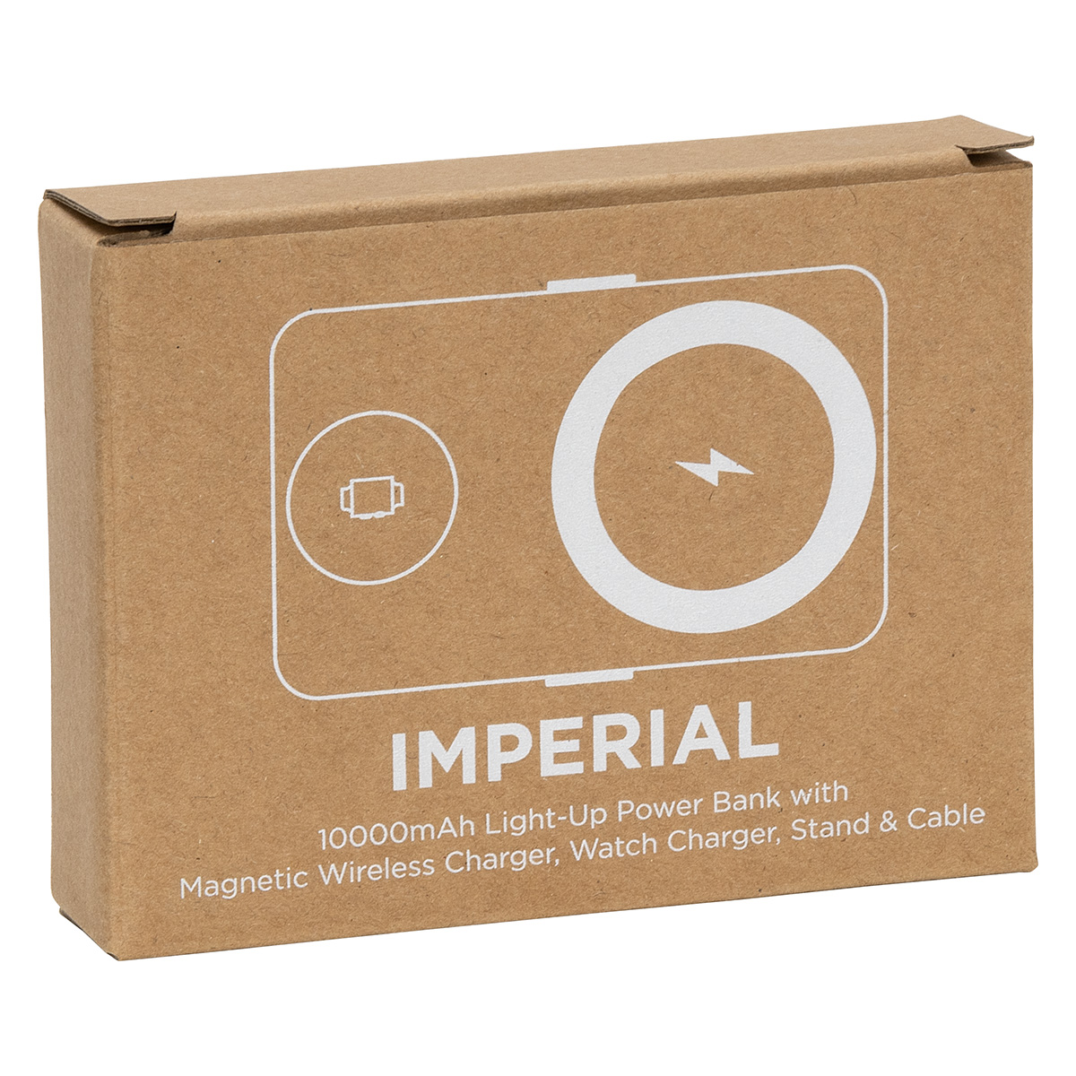 Power up in style with the Imperial 10000mAh Light-Up Power Bank. Featuring a glowing logo that lights up, either as a full color digital print or single color laser print, when the power bank is in use for standout branding. Includes built-in USB-C to Lightning cable, and 20W fast charging, it’s designed for mode convenience. Enjoy 15W magnetic wireless charging, a 2W watch charger, and multiple port options for versatile use. Compact and sleek, it even doubles as a phone stand—making it the ultimate all-in-one charging solution.