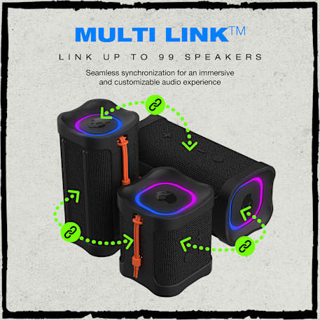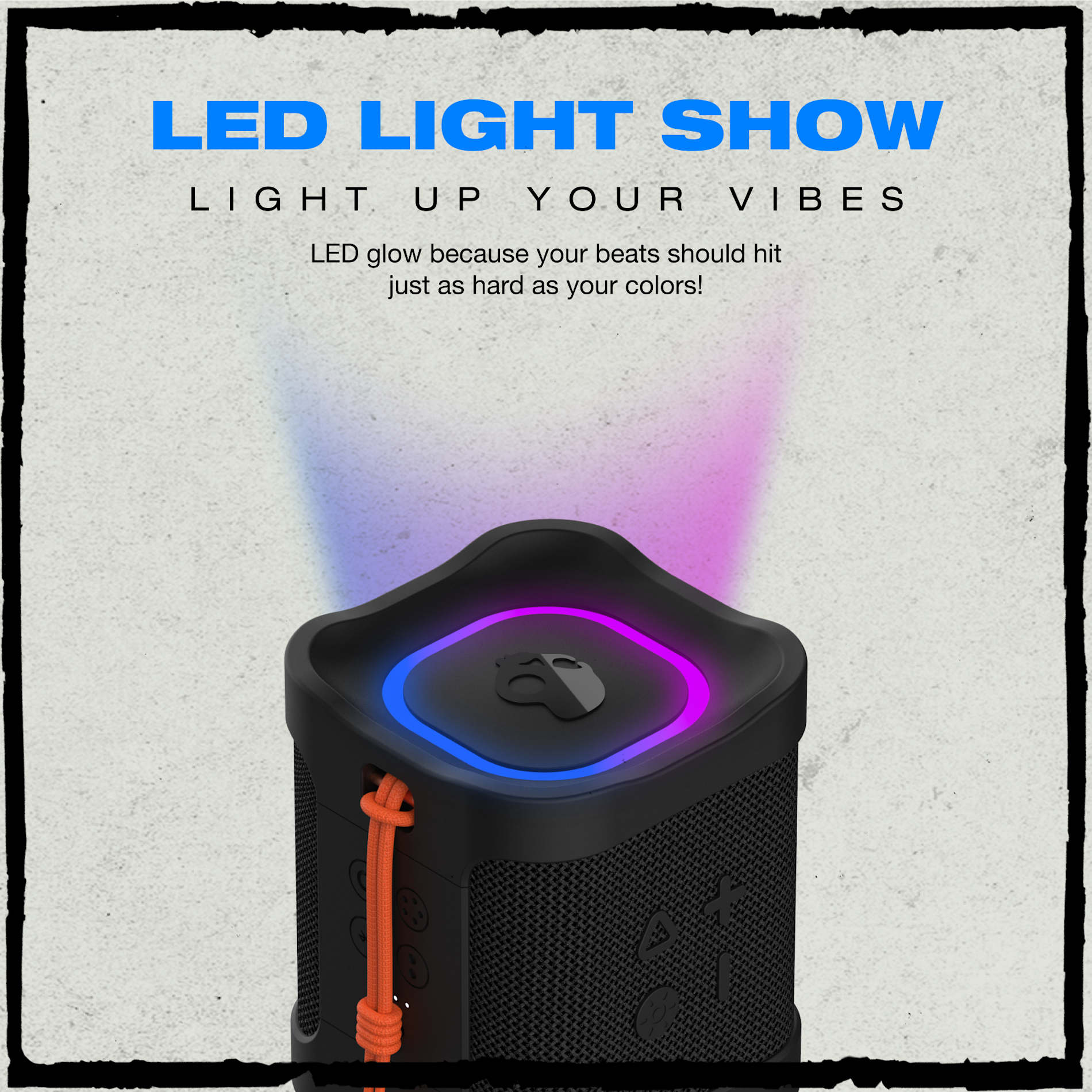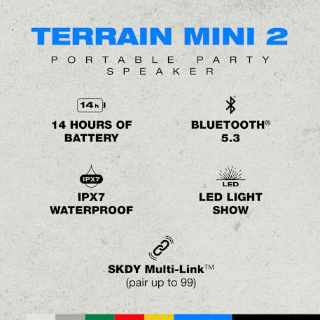 The Skullcandy Terrain Mini 2 provides a sound as bold as you. Take it to a pool party or have a chill game night at home; you’re in charge of the vibe. With twin LED rings and eight light show modes, it will create stunning audiovisual effects that are the envy of every party—built with dual passive radiators for premium sound. IPX7 Waterproof means this speaker can withstand full immersion down to 3 feet for up to 30 minutes. It is a perfect indoor or outdoor everyday speaker. Multi-Link wireless connects to 99 Skullcandy Speakers—up to 14 hours of playback time and a three-hour charge time. Includes built-in music controls and a microphone.