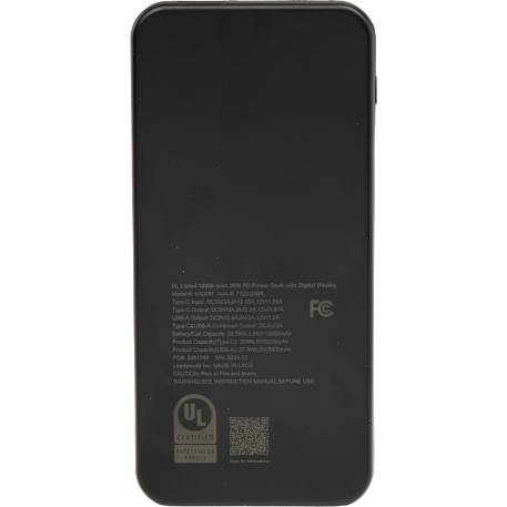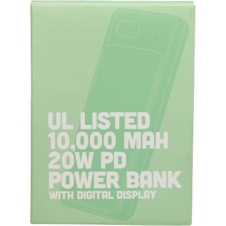 The UL Listed 10000 mAh 20W Digital Display Power Bank feature a rechargeable lithium polymer battery (38.5Wh) for charging smartphones and other devices at 20W charging speed. It also features with digital display to show power capacity. Type-C Input: 5V/3A,9V/2.2A,12V/1.67A (20W max); Type-C Output:5V/2.4A,9V/2.2A,12V/1.67A (20W max); USB-A Output: 5V/2.4A,9V/2A,12V/1.5A. UL certified. Includes a 39-inch Type-C-to-Type-C charging cable. Packaged in an FSC®-certified premium gift box. Power banks are permitted in carry-on luggage only, and at the discretion of TSA agents. Please charge power bank before initial use.