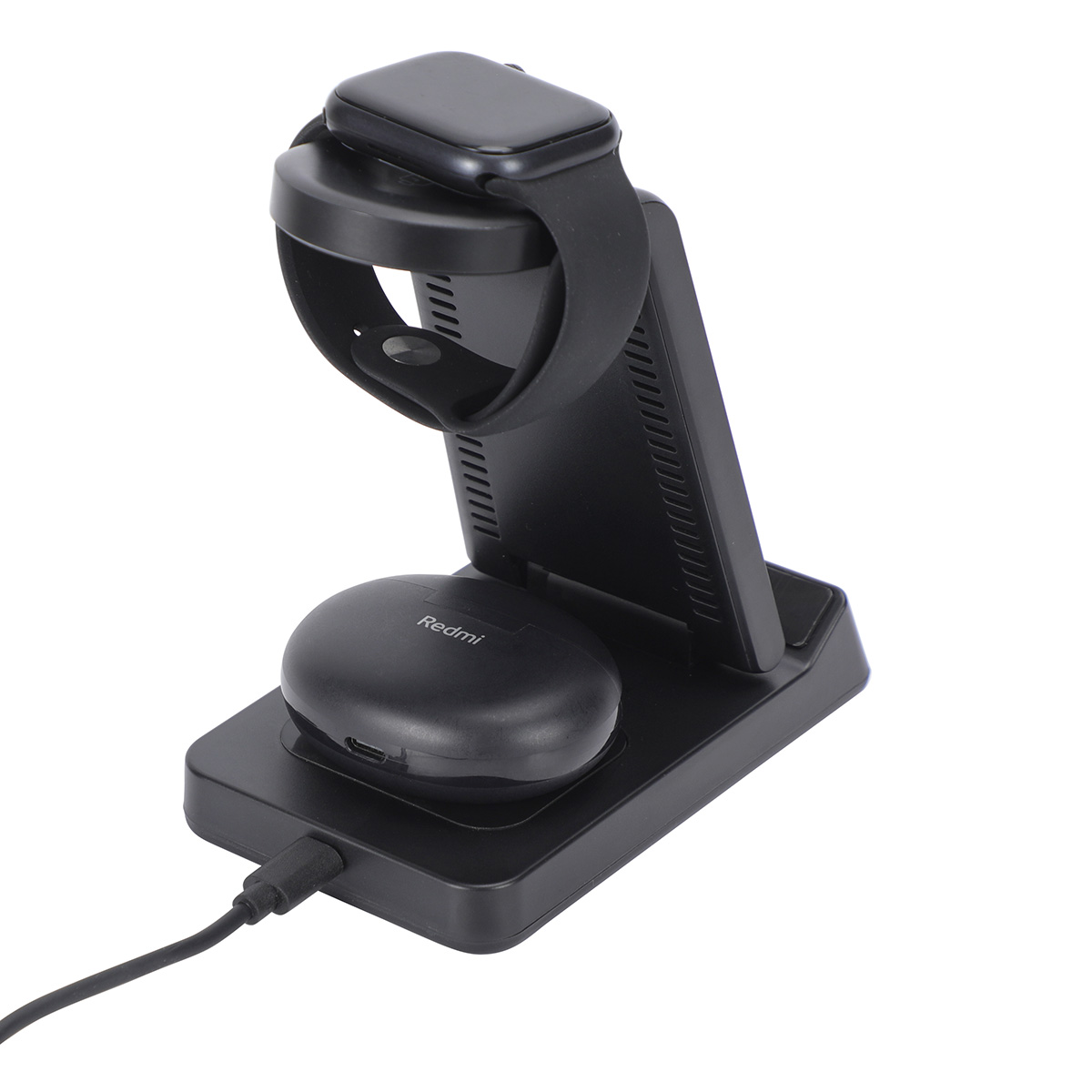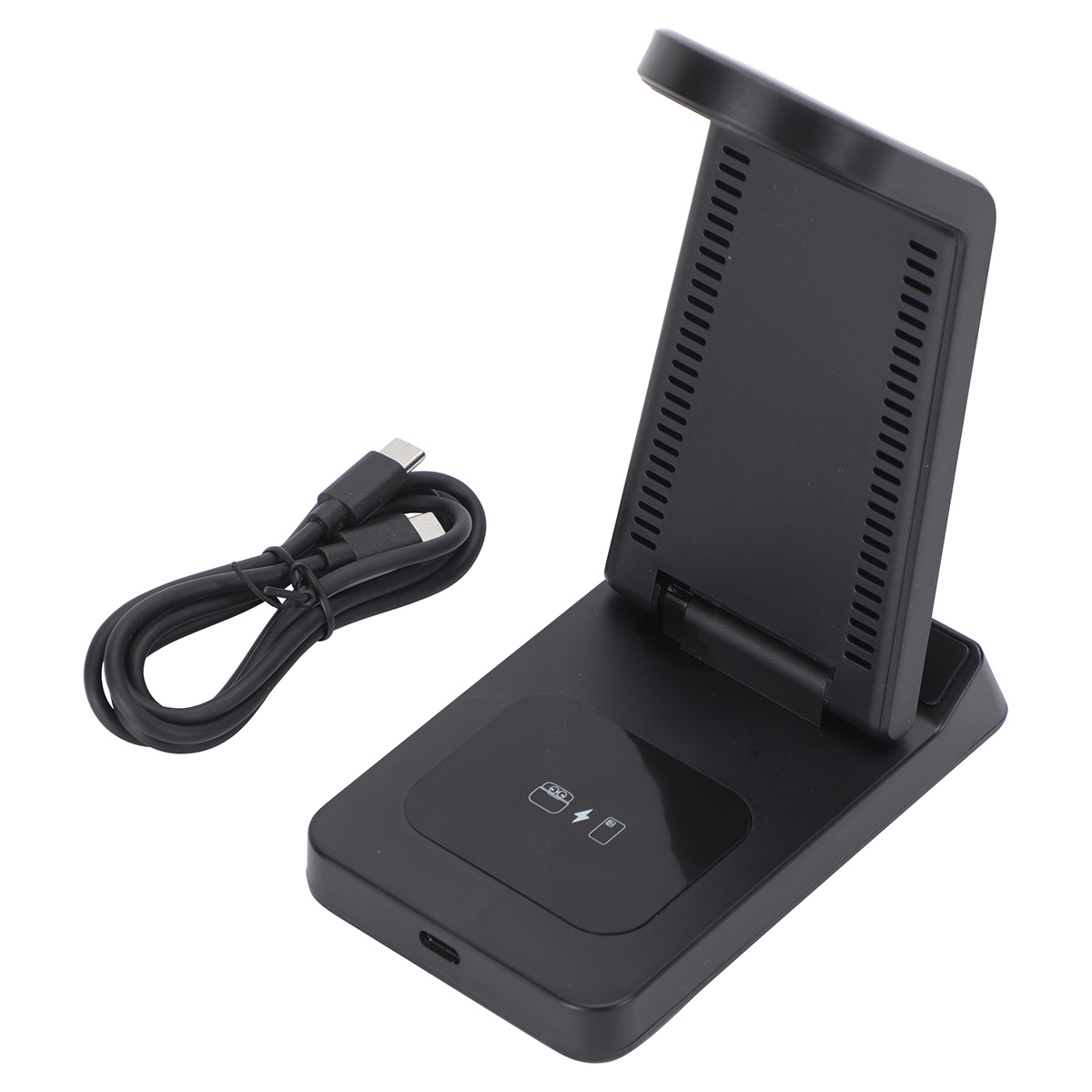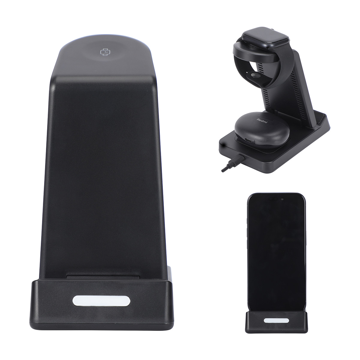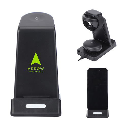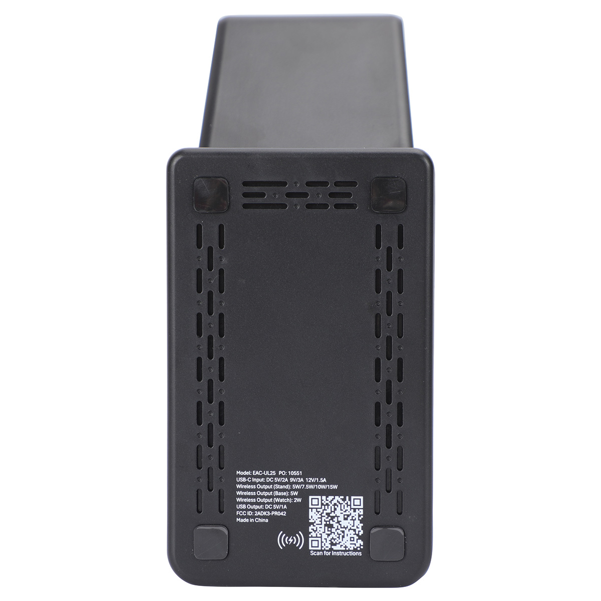 Streamline your charging needs with this Ultra 3-in-1 Power Station, an all-in-one power station, designed for smartphones, Apple Watches, and AirPods. A QR code is printed on each item and/or gift box providing access to the latest user manual. Features include a foldable 15W wireless charging phone stand, a 5W wireless charging base, and a 3W iWatch charger. LED indicator light on front of base. Includes a 39-inch USB-C to USB-C fast charging cable for effortless setup.