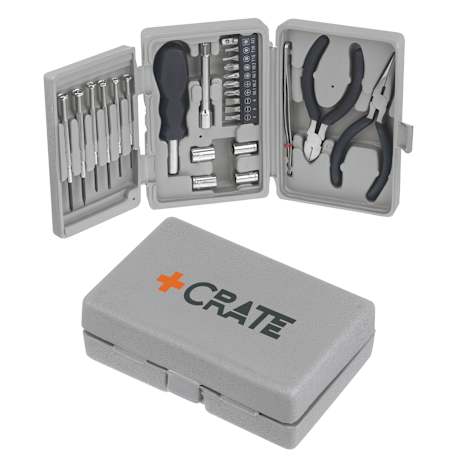 The 26 Piece Deluxe tool Kit includes 6 precision screwdrivers, an extension rod, a bit driver with a plastic handle, a 10-piece screwdriver bits in a bit holder, needle-nose pliers and diagonal wire cutters with matte grip handles, 4 wrench sockets and a pair of tweezers. The 4 wrench socket sizes are 7, 8, 9, and 10 MM. It also includes a tri-fold heavy duty case with a snap closure.
