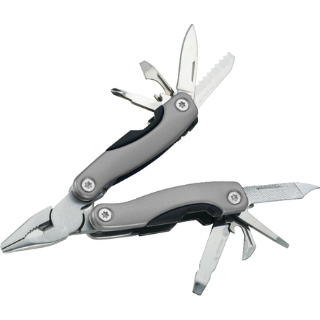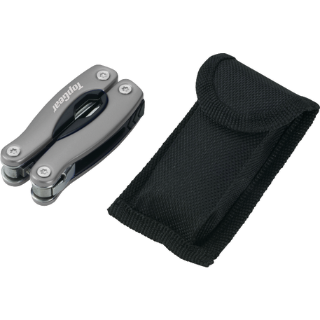 The Tonca 11-Function Multi-tool functions include a pair of pliers, a knife blade, a ruler and scale, a Phillips-head screwdriver, a flat-head screwdriver, a bottle opener, a can opener, saw blade, and nail file. Includes a nylon storage pouch with a belt loop. Imprint available on the multi-tool only.