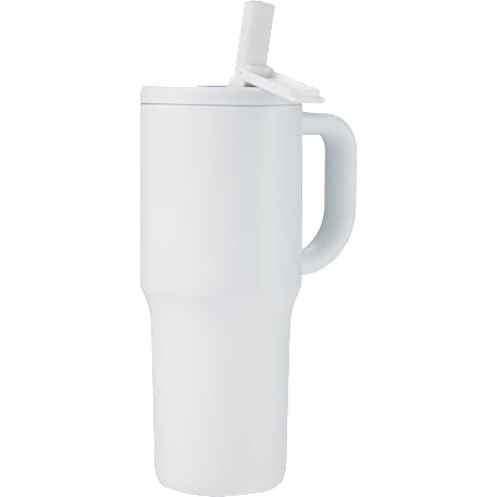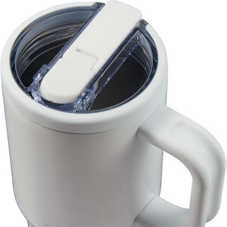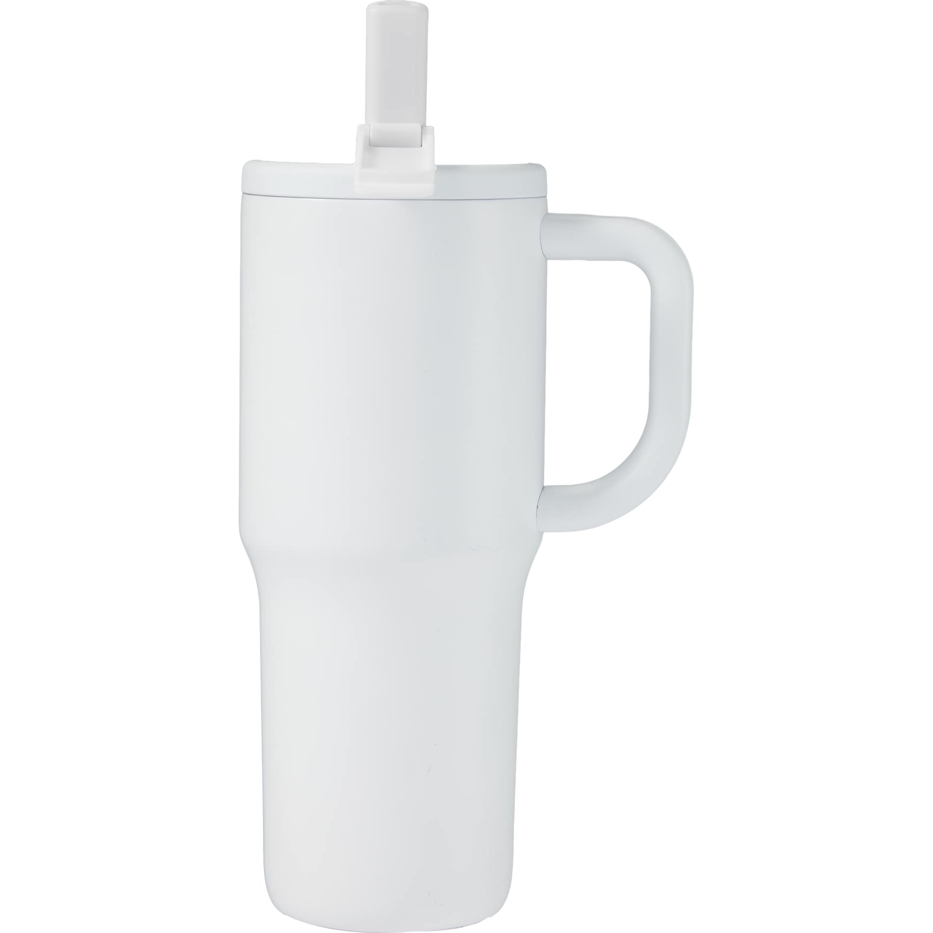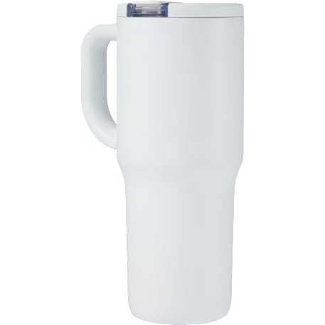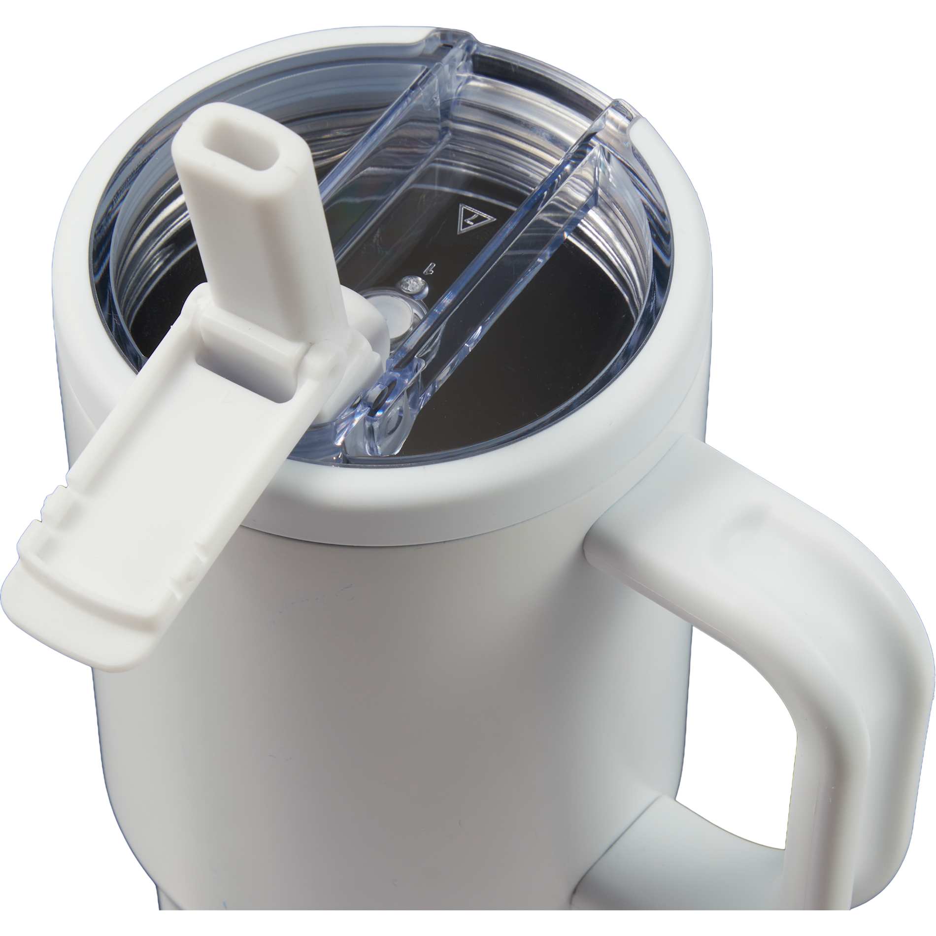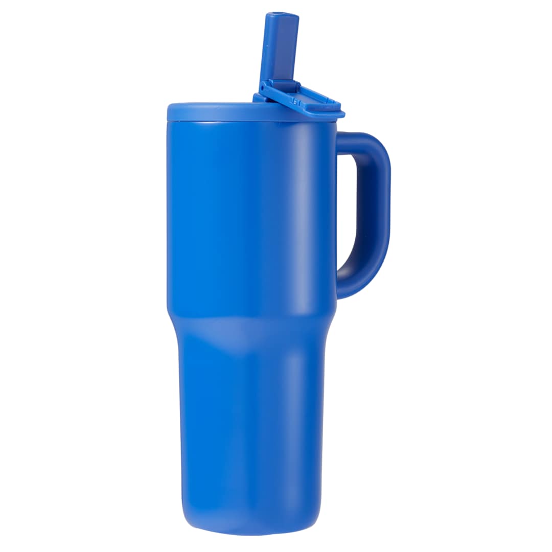 The new Alpine travel Mug is here to hydrate more and refill less. A very comfortable, extremely durable handle takes it to the next level, and the large size can go anywhere, even fitting most cupholders. Double-wall insulation ensures cold stays cold up to 15 hours, and the flip-straw is easy to sip. Built-in straw cap ensures the nozzle stay personal hygiene preventing from the dirt, gems etc. The screw-on lid is splash-resistant. Stylish solf-touch color popping rim helps you screw on or off the lid but still keep the see-through feature on top. It comes with the trendy color drenching look. The inner wall is made from 91% post-consumer recycled 18/8 stainless steel with vacuum insulation. Hand wash only. 30oz.