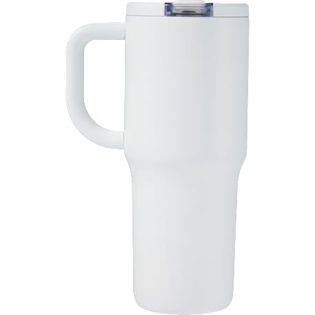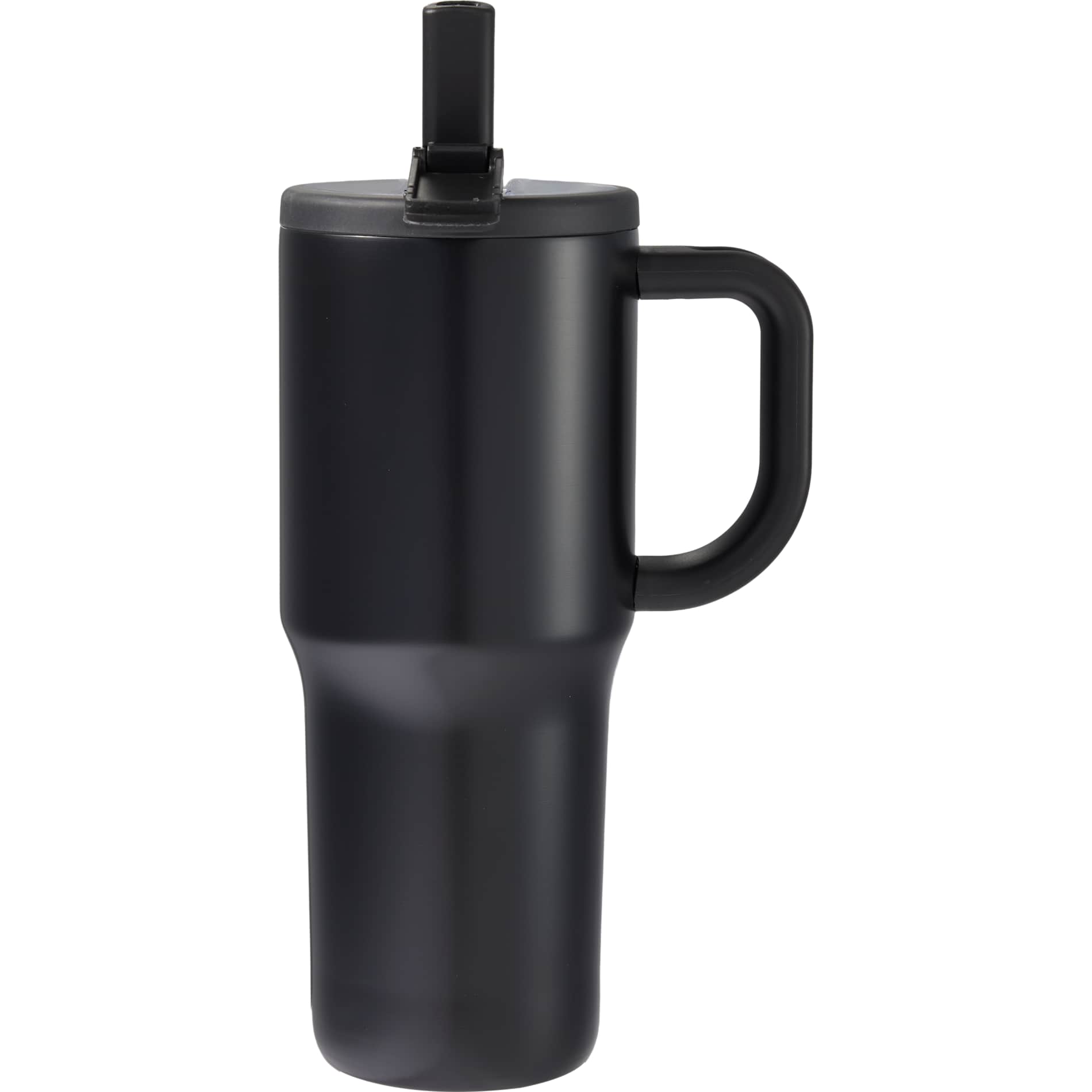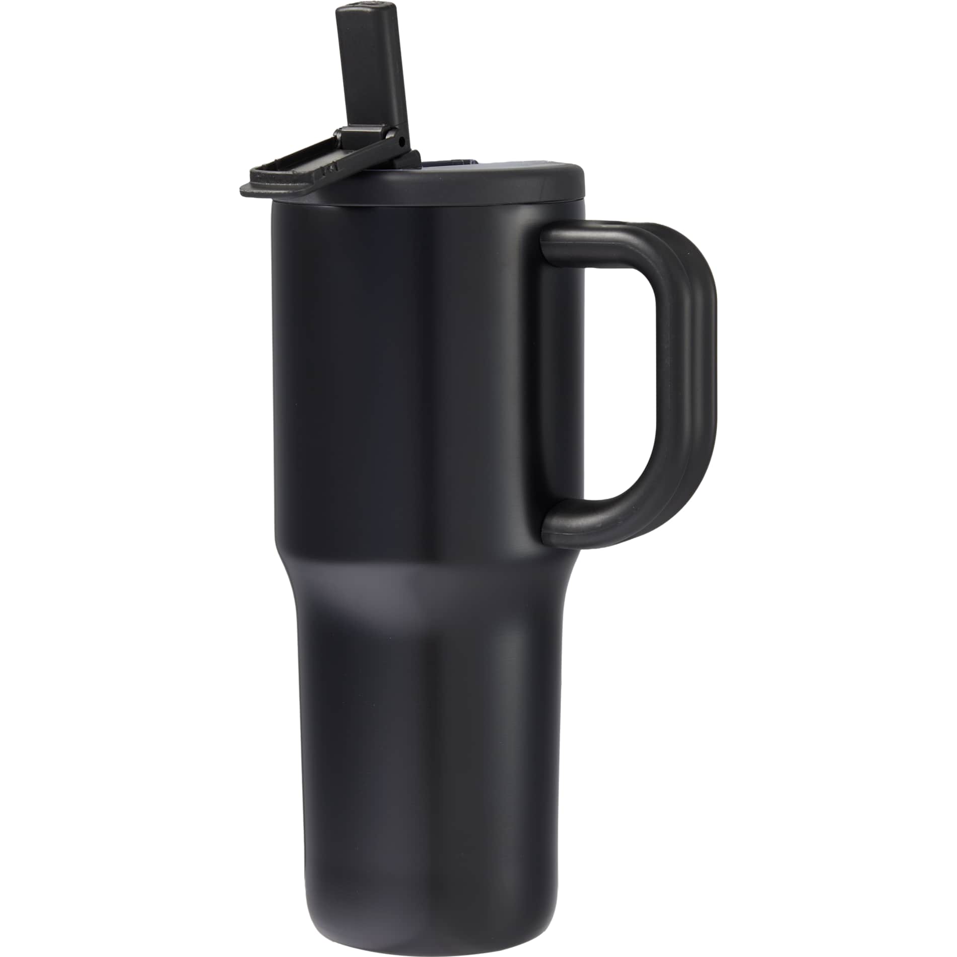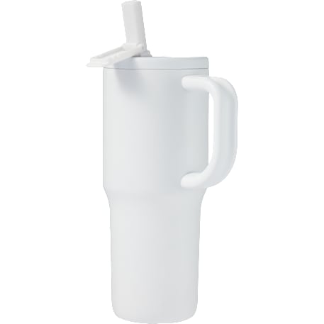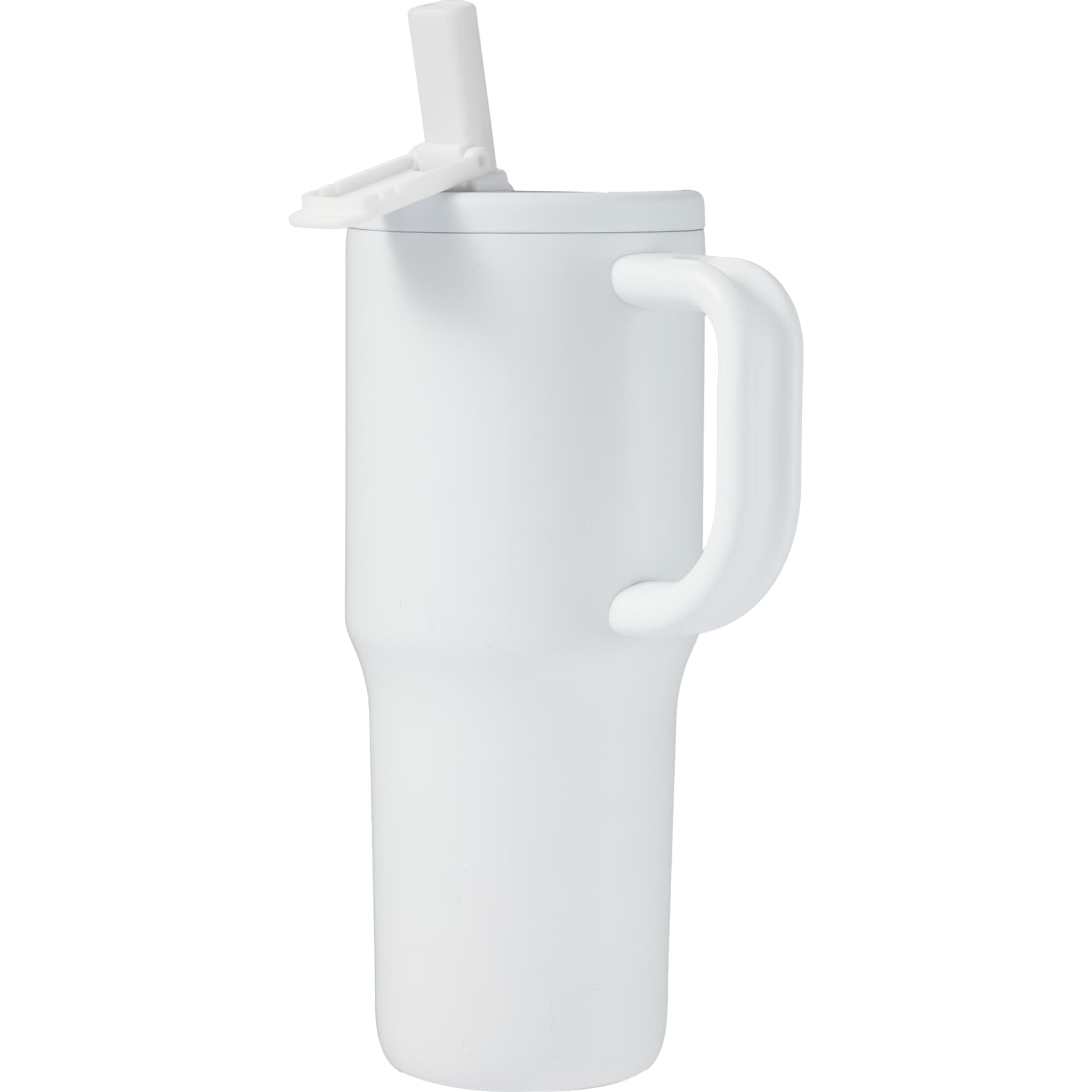 The new Alpine travel Mug is here to hydrate more and refill less. A very comfortable, extremely durable handle takes it to the next level, and the large size can go anywhere, even fitting most cupholders. Double-wall insulation ensures cold stays cold up to 15 hours, and the flip-straw is easy to sip. Built-in straw cap ensures the nozzle stay personal hygiene preventing from the dirt, gems etc. The screw-on lid is splash-resistant. Stylish solf-touch color popping rim helps you screw on or off the lid but still keep the see-through feature on top. It comes with the trendy color drenching look. The inner wall is made from 91% post-consumer recycled 18/8 stainless steel with vacuum insulation. Hand wash only. 30oz.