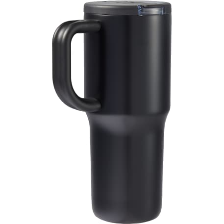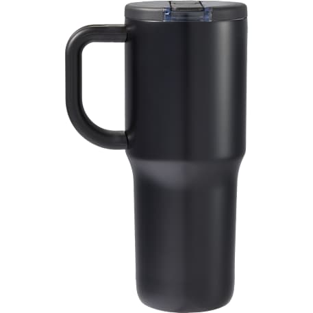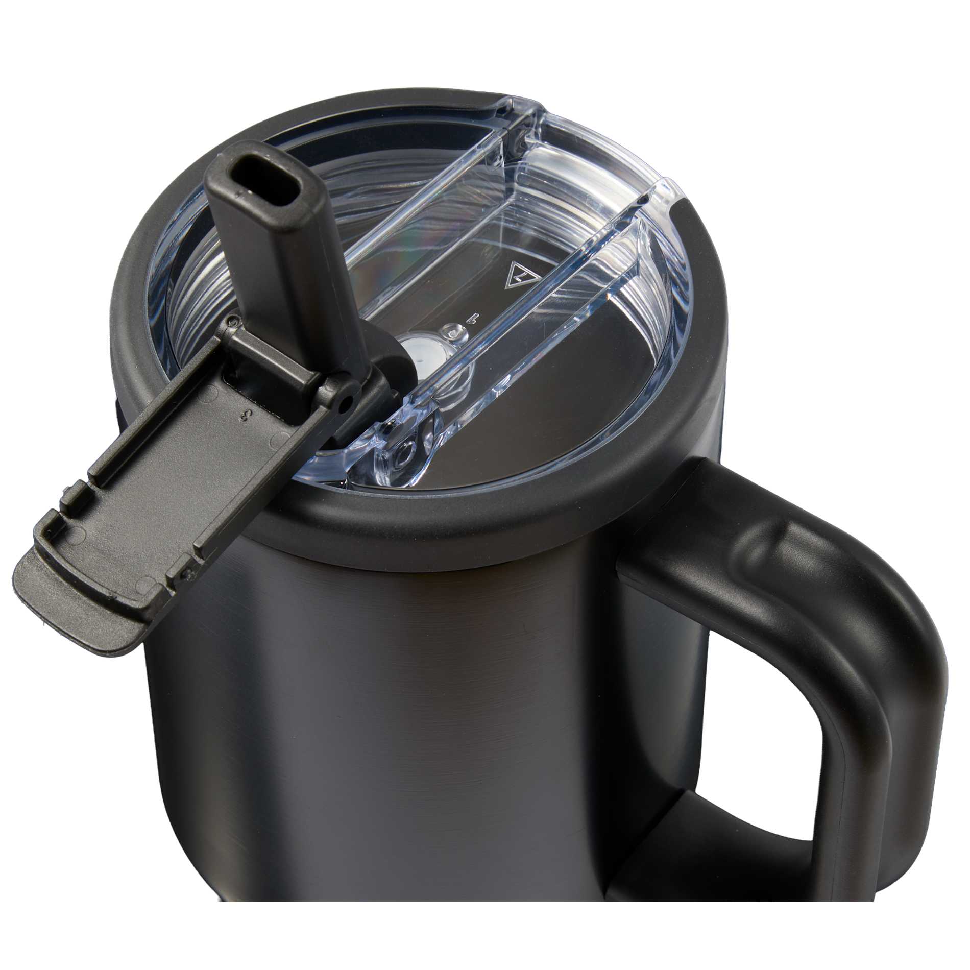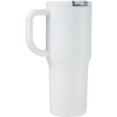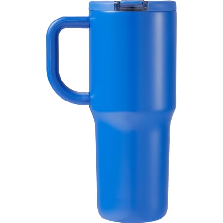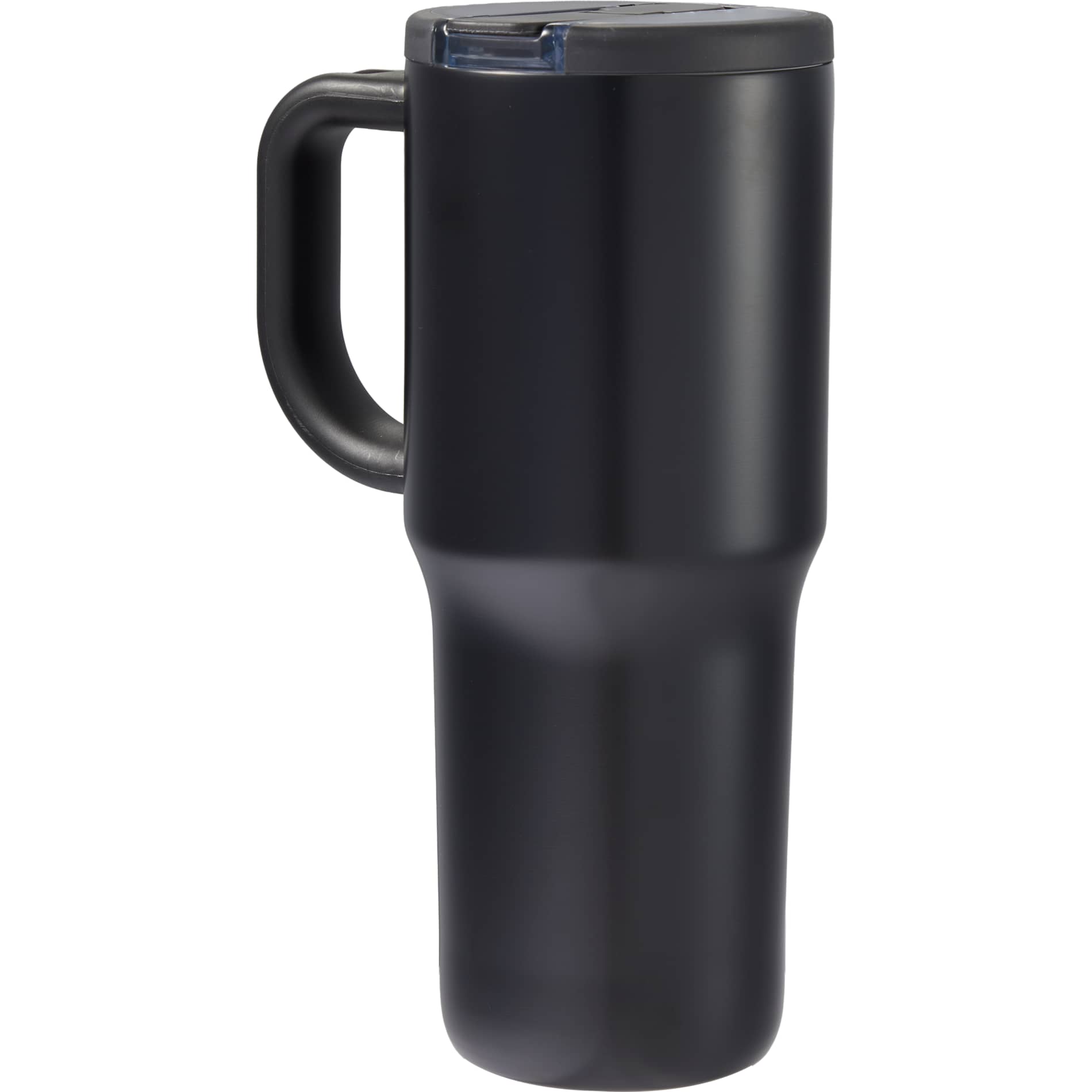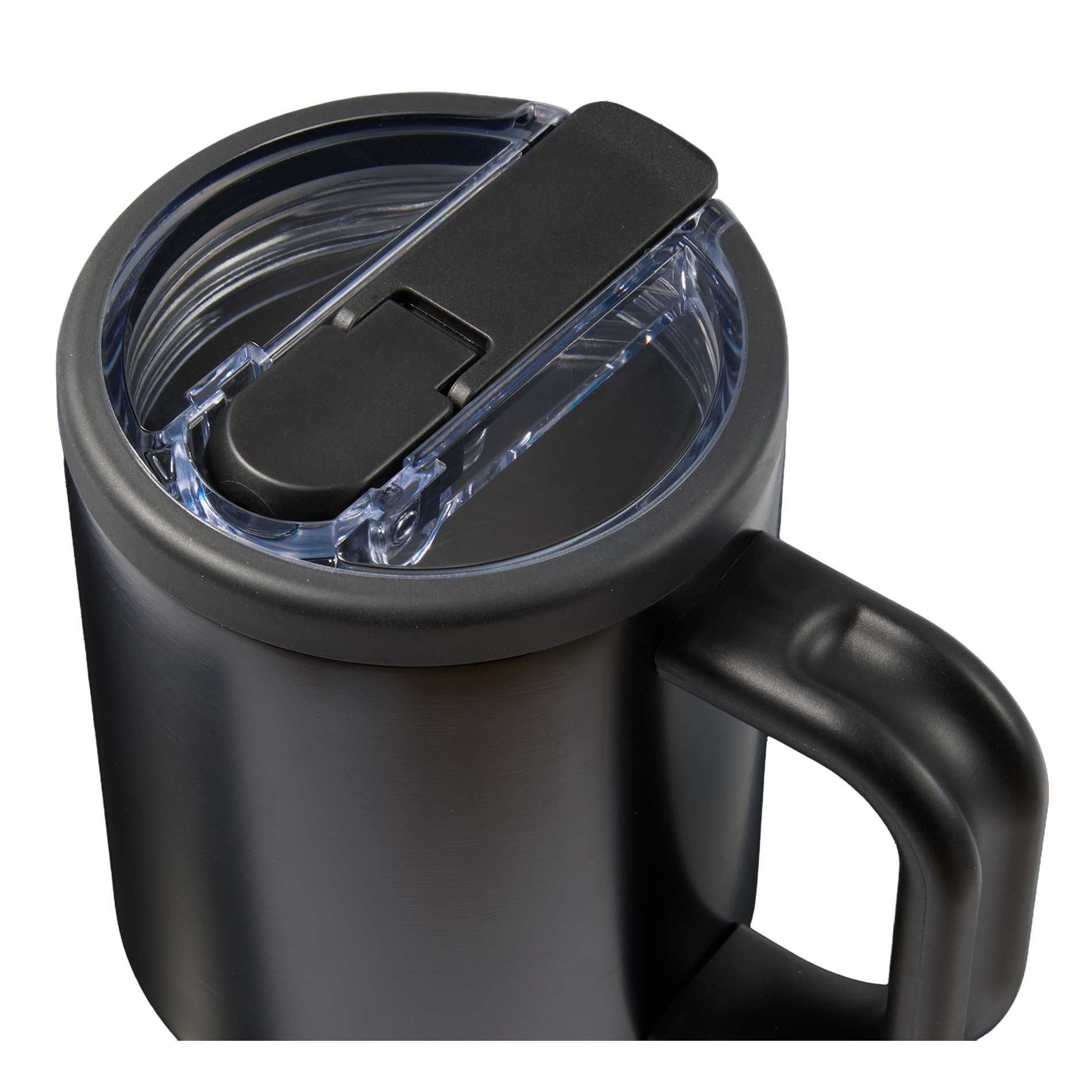 The new Alpine travel Mug is here to hydrate more and refill less. A very comfortable, extremely durable handle takes it to the next level, and the large size can go anywhere, even fitting most cupholders. Double-wall insulation ensures cold stays cold up to 15 hours, and the flip-straw is easy to sip. Built-in straw cap ensures the nozzle stay personal hygiene preventing from the dirt, gems etc. The screw-on lid is splash-resistant. Stylish solf-touch color popping rim helps you screw on or off the lid but still keep the see-through feature on top. It comes with the trendy color drenching look. The inner wall is made from 91% post-consumer recycled 18/8 stainless steel with vacuum insulation. Hand wash only. 30oz.