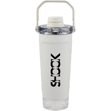 Introducing the Activate Shaker Bottle. Made to energize. Designed to fuel your best self. Infuse your water or add protein. Fill. Shake. Drink. The 20-ounce Activate Shaker Bottle keeps your drink cold for hours, thanks to double-wall vacuum insulation. A rounded interior makes mixing and cleaning easy, while the fast flow spout provides a better sip. The inside is stamped with measurement lines and includes a removable strainer. The base storage container and the soft, easy-grip handle are great for on the go. And with a leakproof Tritan lid, it’s ready to toss in your bag. Hand wash.