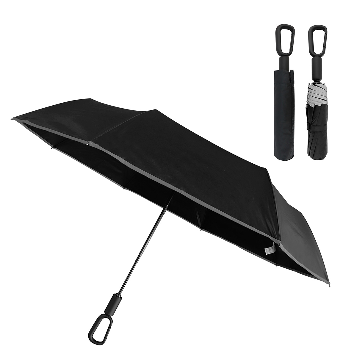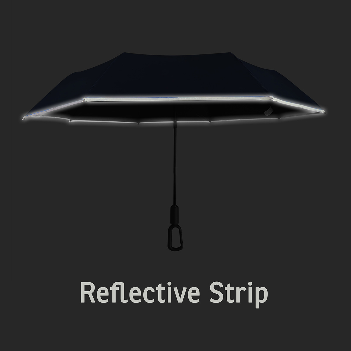 Stay prepared for any weather with our stylish compact umbrella, expertly designed to easily fit into your purse or backpack. Featuring reflective edge trim for enhanced visibility, this umbrella boasts 8 durable panels covered in high-quality 190T Pongee fabric. The UV protection coating ensures comfort during sunny days. It comes with a color-matched sleeve and a convenient carabiner handle for attaching to bags. The auto-open feature adds instant accessibility, making it the perfect blend of function and style!
