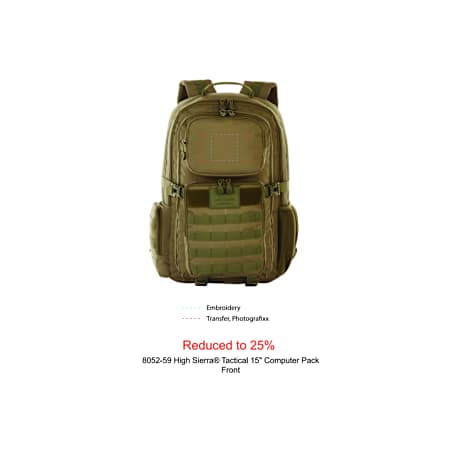 The High Sierra® Tactical 15" Computer Pack features a zippered main compartment that holds up to a 15 inch laptop. Additional zippered compartment for extra storage. Two front zippered pockets with organizational panel and key fob. Tactical straps run along the front of the bag, as well as on the side gussets. Hang your carabineers and all of your essentials off of theses tactical straps. Compression straps to decrease the depth of the bag which are located on the side and bottom of the backpack. Includes a side mesh water bottle pocket and a mesh padded back panel, padded shoulder straps and a ste um strap for added comfort. High Sierra brandings. Includes lifetime warranty.