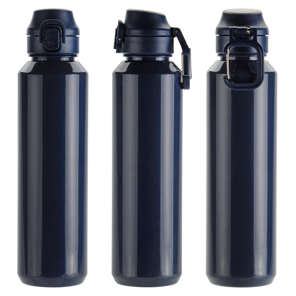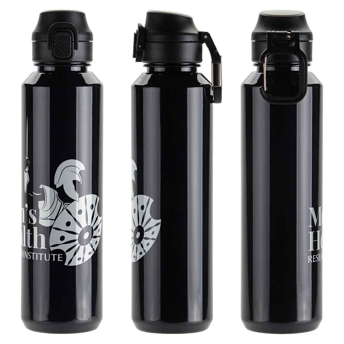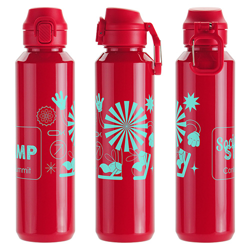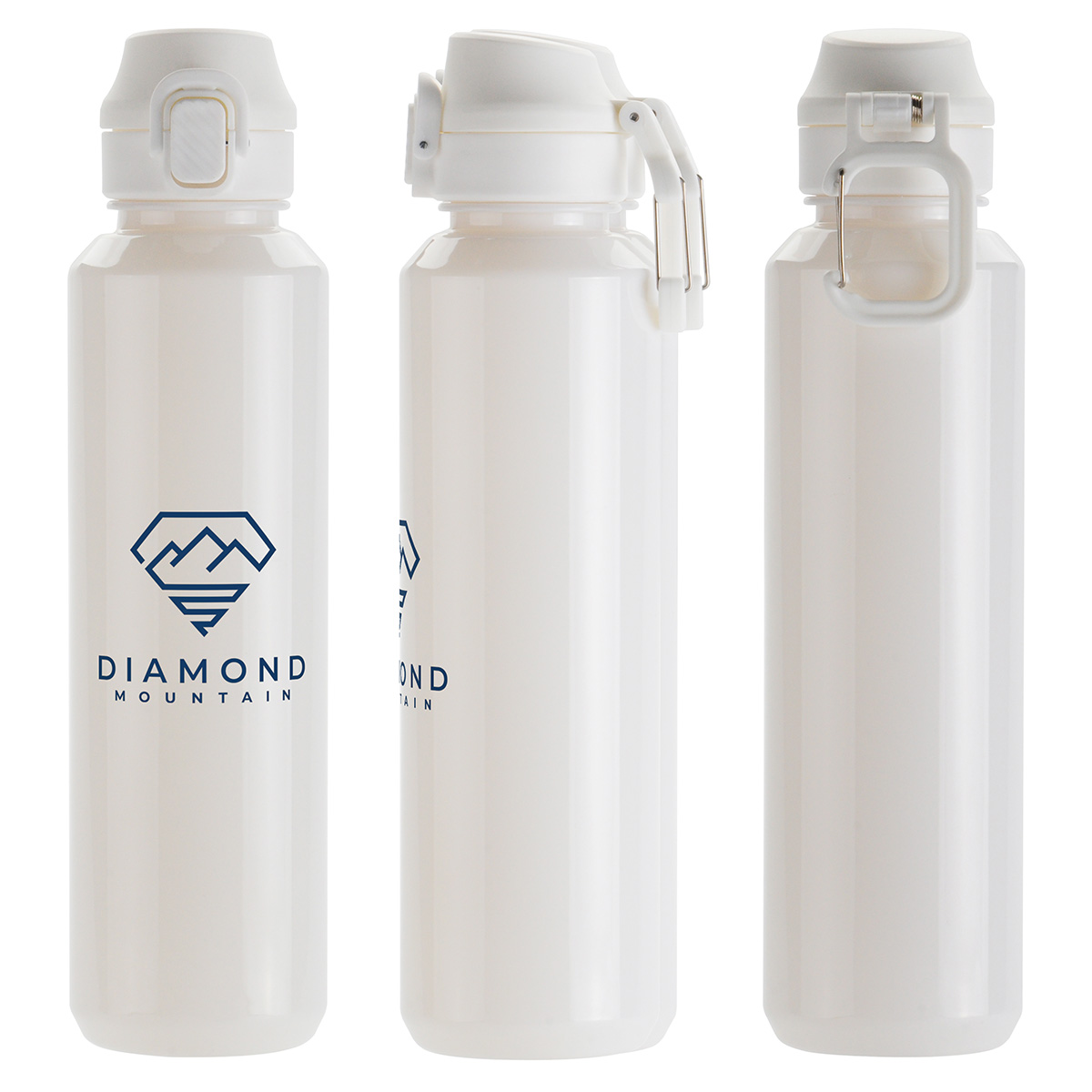 Quench your thirst with our Switchback 27 oz RPET Bottle with Snap-Top Lid & Carabiner, designed for both style and functionality. Featuring a convenient snap-top lid for easy access and a carabiner for attaching to backpacks for portability, it keeps beverages hot or cold for up to 3 hours. Made from BPA-free materials and FDA certified for safety, this bottle is perfect for everyday use. Hand wash only.