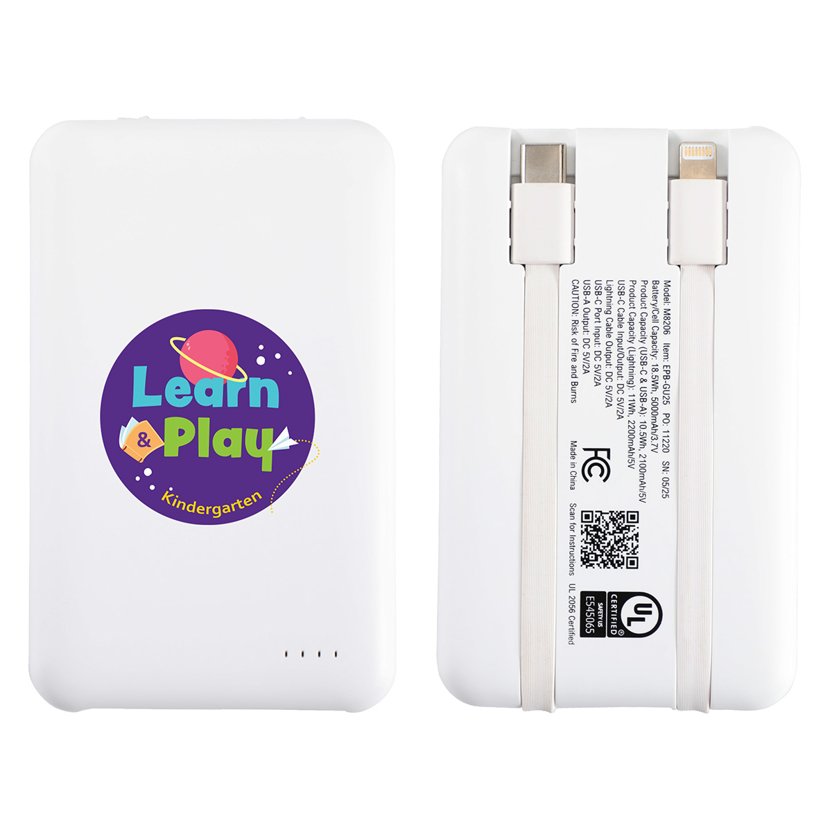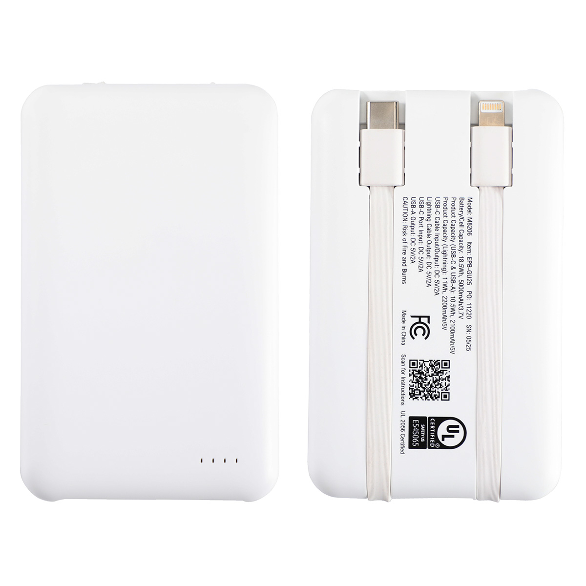 Stay powered up anywhere with the Guild 5000mAh UL-Listed Power Bank! Designed with built-in USB-C and Lightning cables, it delivers fast charging without the hassle of extra cords. A QR code is printed on each item, providing access to the latest user manual. Featuring dual input/output ports for ultimate versatility, this slim and lightweight power bank keeps phones, tablets, and accessories ready for action—perfect for travel, work, or everyday use.