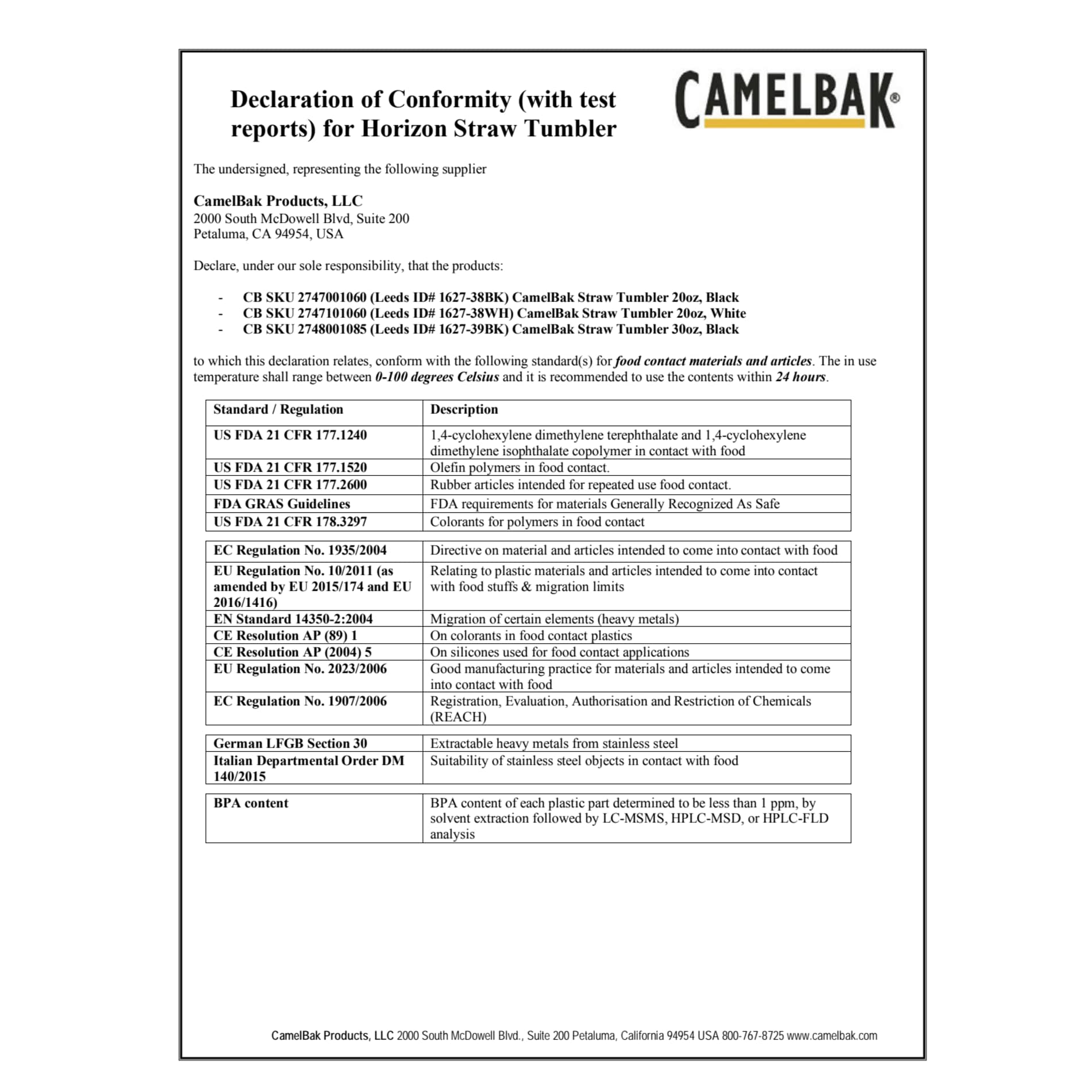 The CamelBak® Straw Tumbler 20oz is the perfect cup to house your favorite summer beverages, whether out on a cross-country road trip or a full day on the water. You can always count on the Horizon Straw Tumbler to keep your beverages frosty cold, plus the straw lid adds splash-free convenience and helps prevent the use of wasteful single-use straws. Like all of our drinkware, you can count on the durable construction to last for season after season. It features spill-resistant Tritan straw lid, as well as the non-slip silicone base. The Tritan straw is shatter, taste, and odor resistant. It is constructed with double-wall 18/8 stainless steel material and sweat-proof vacuum insulation in between. This 20oz straw tumbler comes with the durable powder coating and it is BPA-free. Not recommended for very hot liquids due to straw design. Leed’s Exclusive.