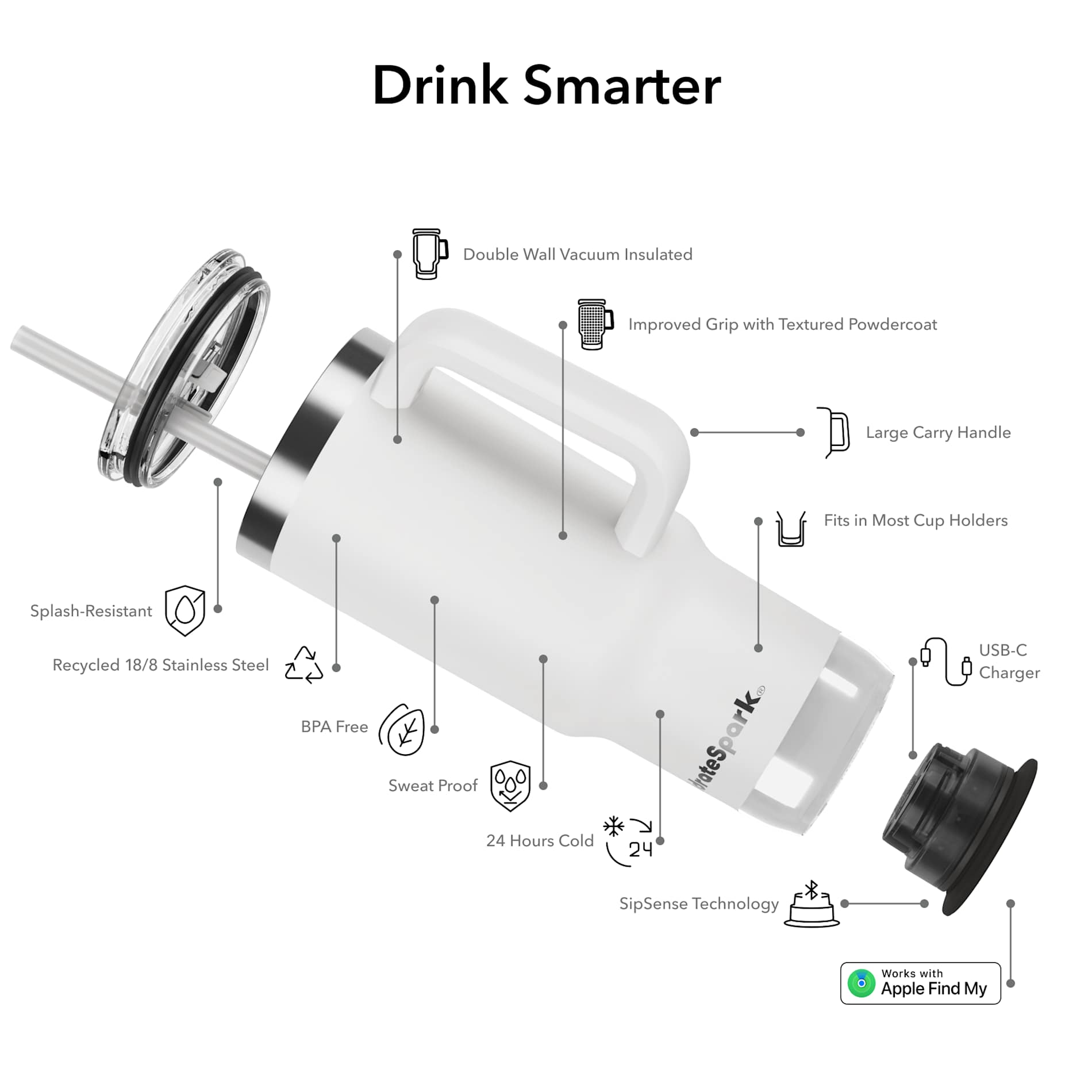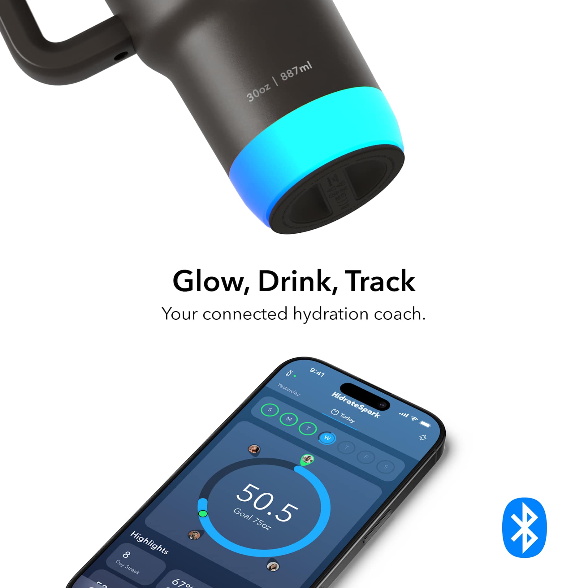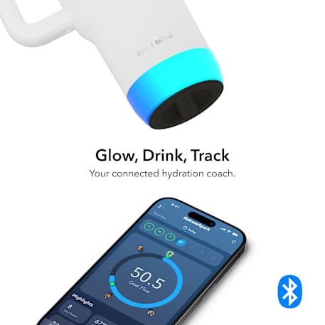 Stay hydrated like never before with the 30 oz HidrateSpark PRO 2, the world’s smartest tumbler made from premium recycled stainless steel. Double-wall vacuum insulation keeps your drink cold for up to 24 hours, or hot for 4 hours, while the PRO 2 sensor with SipSense technology tracks every sip and reminds you when it’s time to drink with a customizable 360-degree glow and optional sound alerts. Sync your water intake with the HidrateSpark App via Bluetooth to monitor your progress, set personalized goals, and even locate your bottle using Apple’s Find My Network. The ergonomic handle and narrow base make it cup-holder friendly and easy to carry wherever you go. Choose your perfect drinking style with the versatile press-in lid featuring a secure straw seal or a drink opening, perfect for splash-free travel.