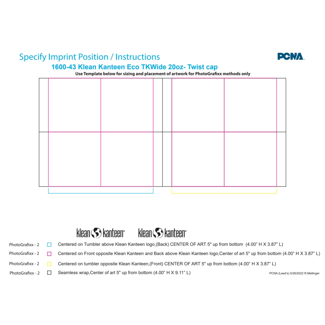 | Centered on Tumbler above Klean Kanteen logo, - (Back) CENTER OF | Color Print SilkScreen - Drinkware | Charge Name:SETUP MULTI-COLOR Charge $95 |